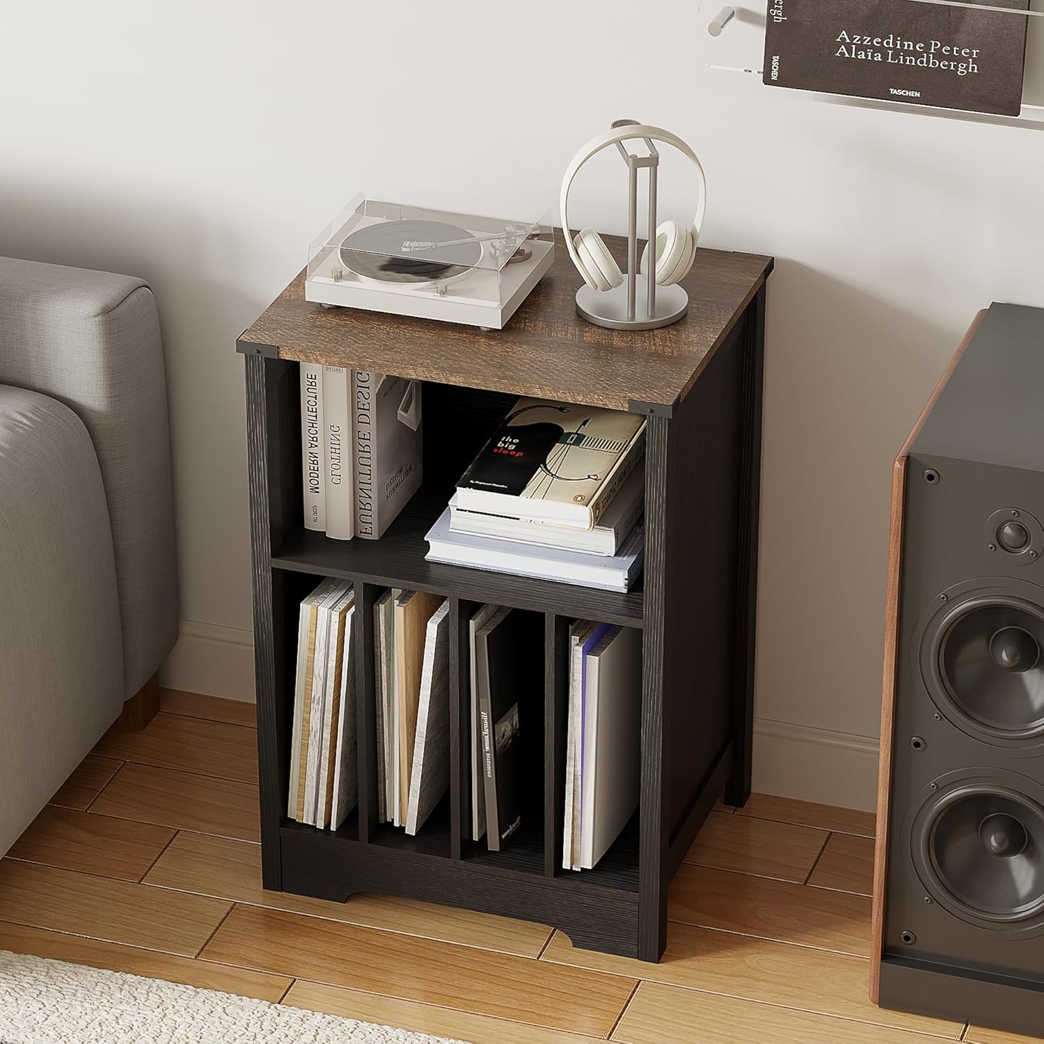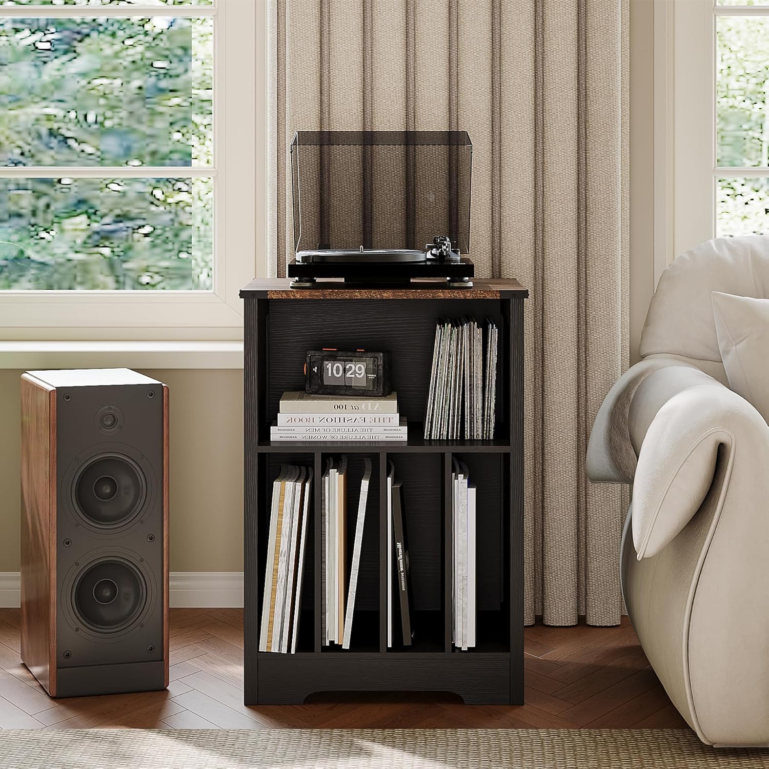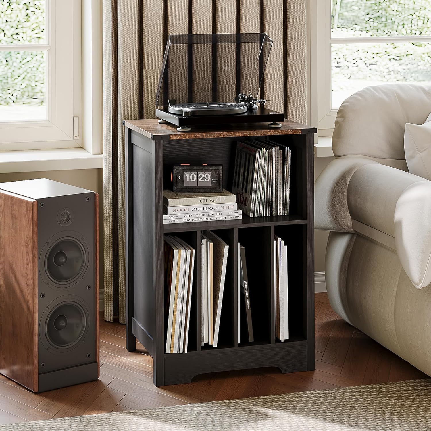 - 【Ample Storage Space】The open shelves in the upper part and the four-grid storage rack in the lower part allow you to store vinyl records according to different music styles for easy storage and organization