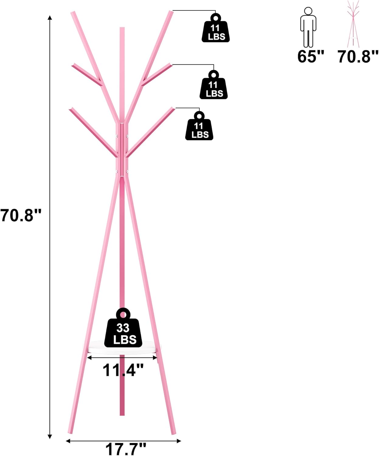 - 【Decorative and Functional Metal Coat Hanger Stand】Practical and at the same time can be a good decoration at home.Ample storage space,totally 3 main branches with 9 hooks ,this coat hat standing hanger is a perfect storage solution for coats,handbags,scarves,hockey gear,motorcycle helmets,jackets,gloves and more.The bottom circle shelf can store drawer units ,bins,toys and flowerpot as you please.