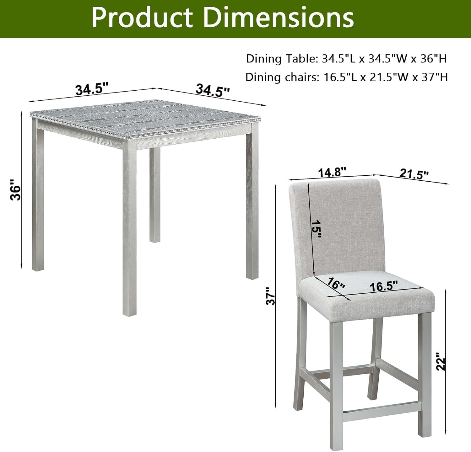 KEIKI 5-Piece Counter Height Dining Table Set with Square Table and 4 Upholstered Chair, for 4 Person, Modern Crystal Decoration Wooden Table Set, Easy Assembly, for Kitchen, Dining Room, Silver Grey
