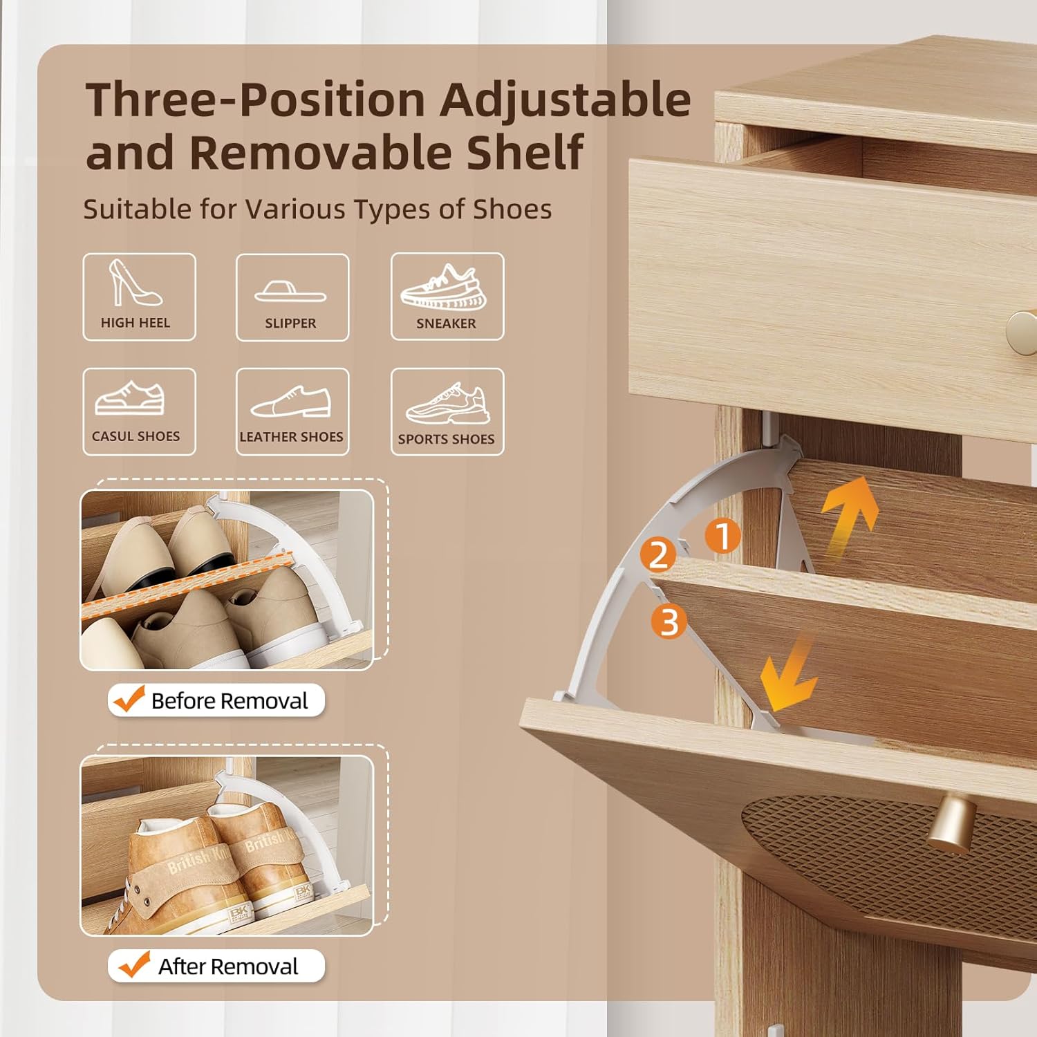 - Spacious & Versatile Shoe Organizer: Featuring 2 flip drawers and 1 additional drawer, including a top drawer ideal for small items, with adjustable middle partitions to accommodate larger shoes such as mid-calf boots and sports shoes. This smart storage design helps keep your space tidy, organized, and clutter-free.