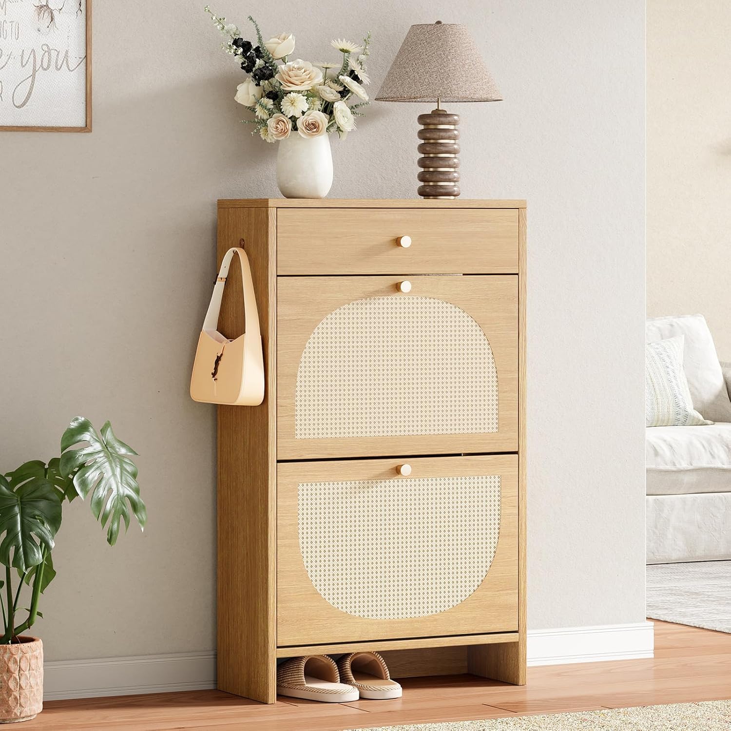 - Elegant Rattan-Look Printed Design:Combining stylish and eco-friendly Rattan-Look printed design, this modern standalone flip-top shoe storage cabinet is space-saving, neat, aesthetically pleasing, and adds a touch of sophistication and nature-inspired beauty to any room, seamlessly blending with various home decor styles.