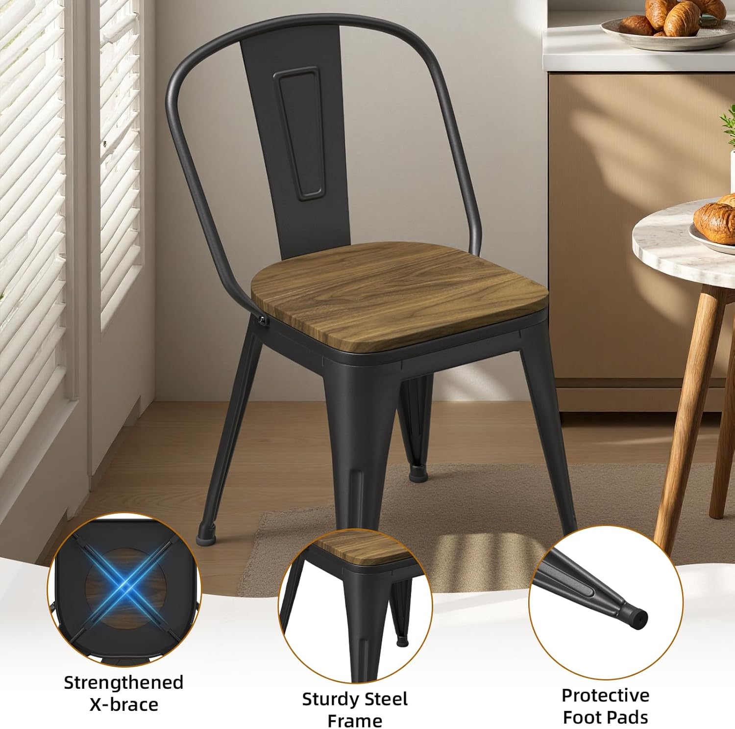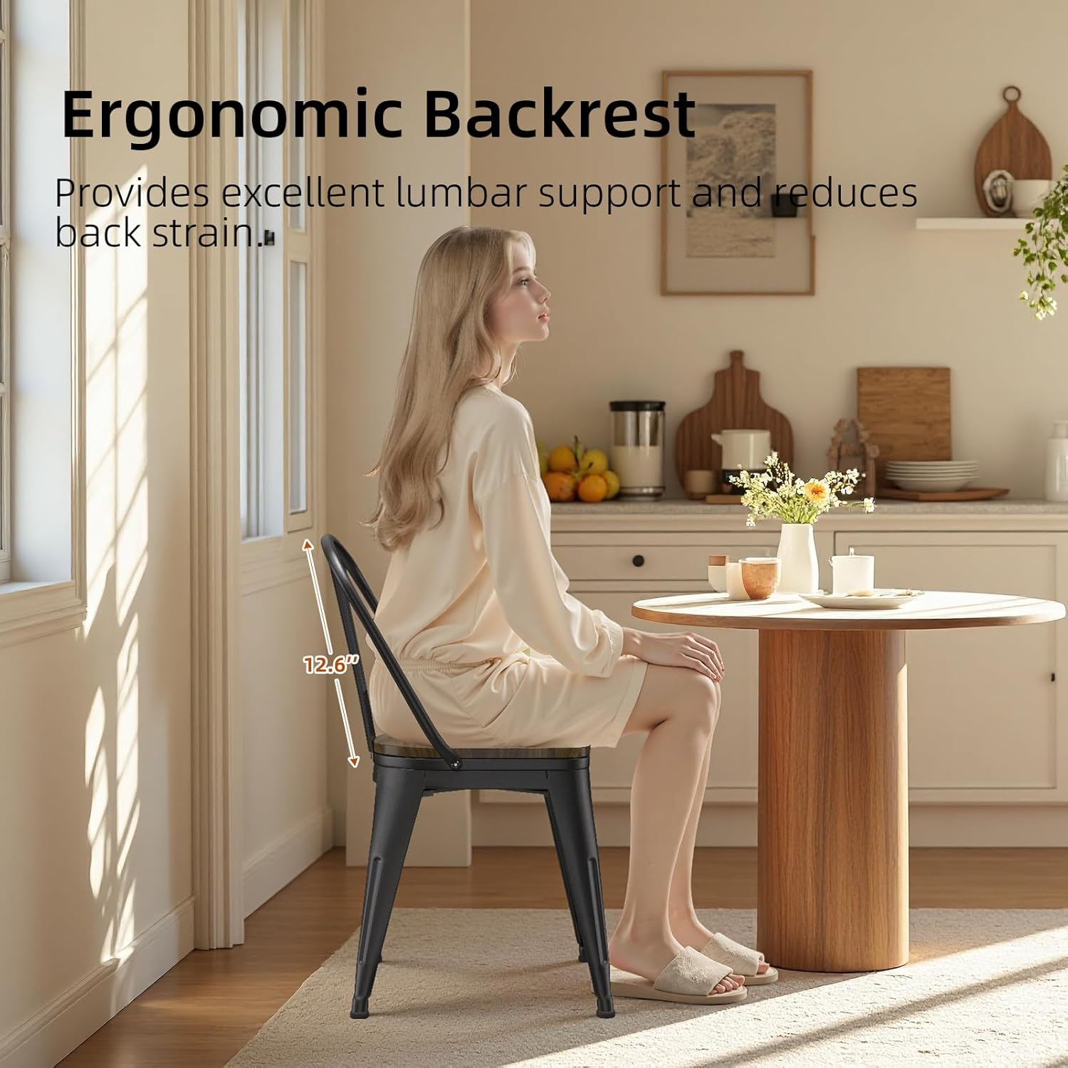 18 Inch Dining Chairs Set of 4, Farmhouse Metal Chairs with High Back and Wooden Seat, Stackable Industrial Bar stools for Dining Room(Black)