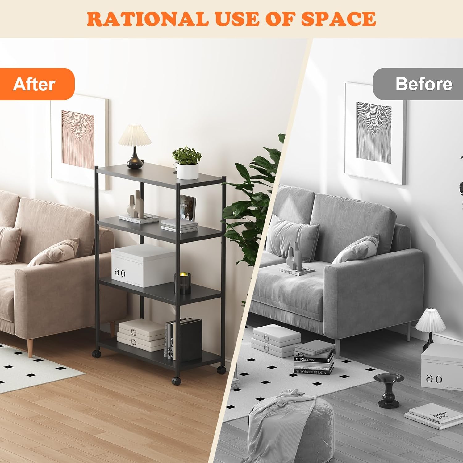 ZZL 4 Tier Bookshelf 31.49" Width,Book Organizers and Storage w/Wheels,Rustic Industrial Book Shelves for Home Office,Bedroom,School,Living Room(Black)