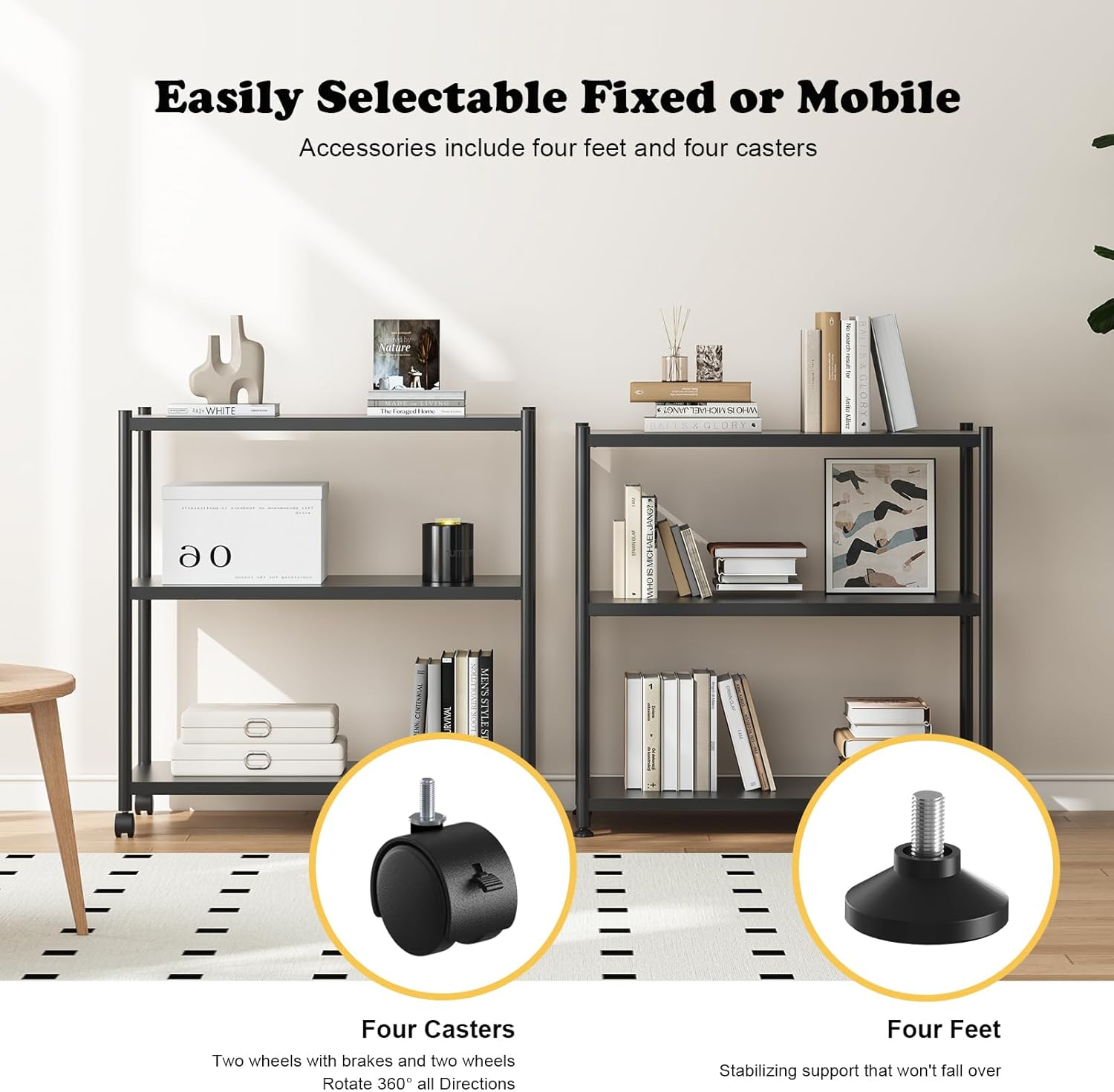 - Adaptable Mobility Options:Choose stationary mode with floor pads or roll-and-lock convenience with casters (not included) Perfect for rearranging during redecorating or moving rooms mid-project
