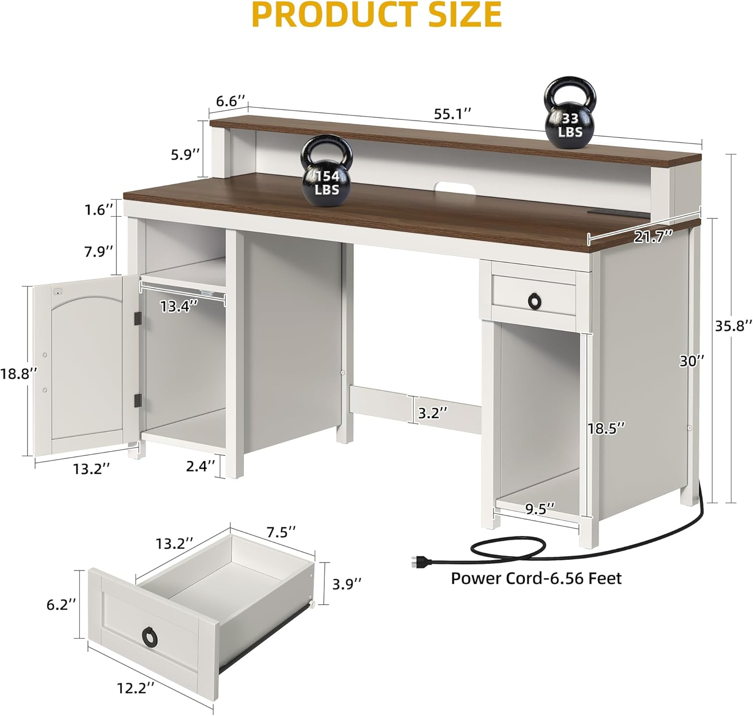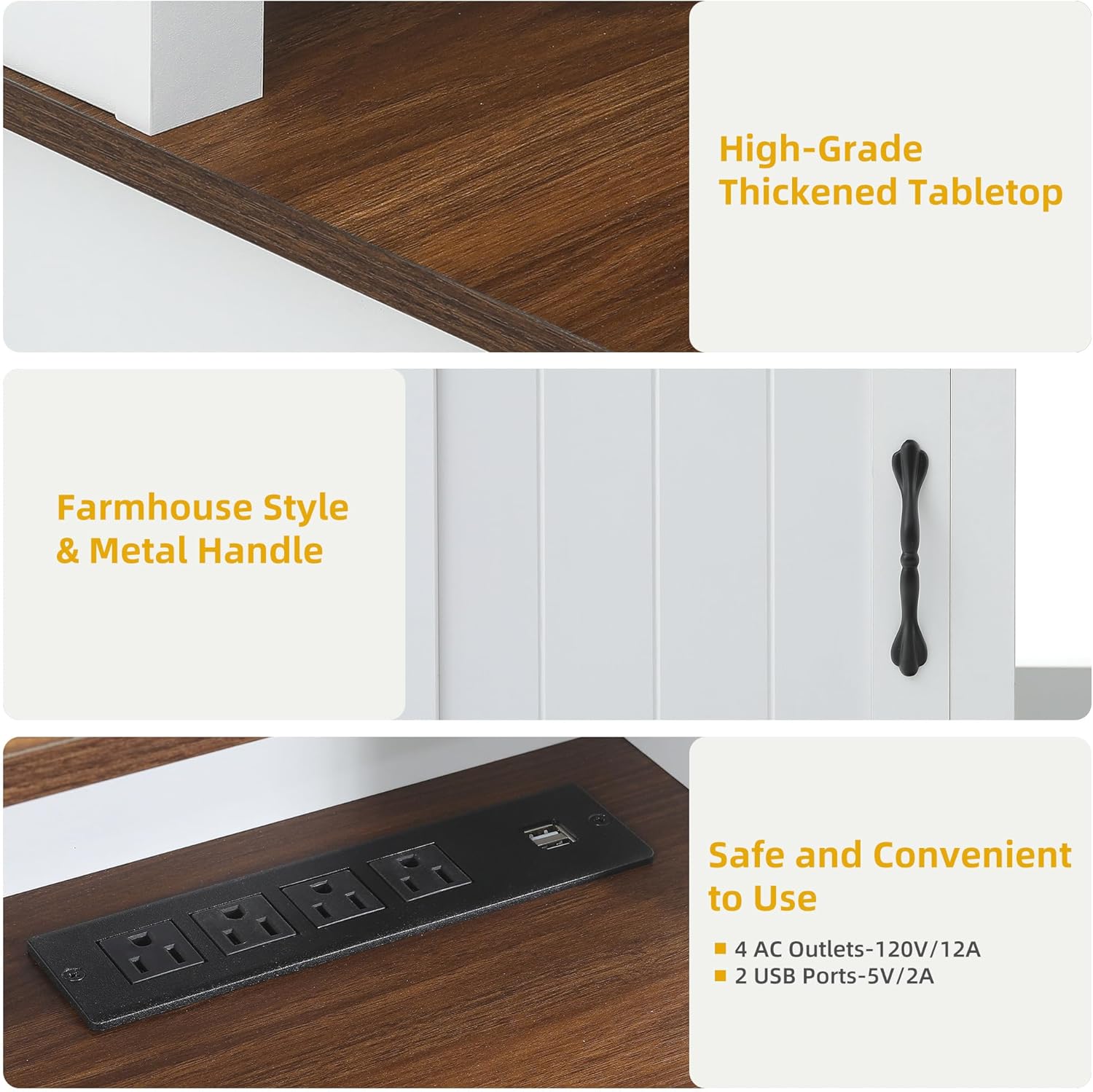 - Farmhouse & Multi-Functional: Our farmhouse desk with drawers blends rustic charm with modern functionality. Its built-in charging station features 4 AC outlets & 2 USB ports for your pads, phone, bluetooth, headset, laptop, power bank, gaming gear. The elevated monitor stand reduces fatigue and visual strain during watching, enhancing comfort for your back and neck