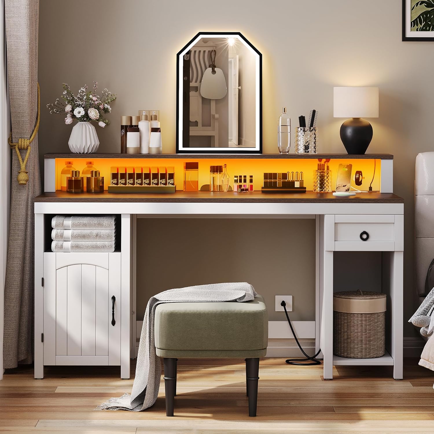 DWVO Farmhouse Office Desk with Drawer & Power Outlets, Wood Computer Desk w/LED Strip & Monitor Stand for Bedchamber Study, Home Office Table with Storage Cabinet for Working Writing Gaming (White)