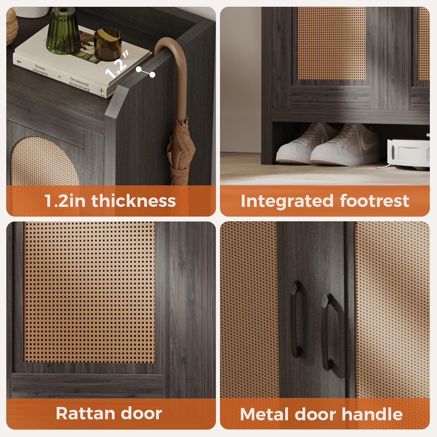 Shoe Cabinet Storage for Entryway, Natural Rattan Shoes Cupboard, Wooden Shoe Rack with Doors and Shelves, Farmhouse Boho Wood Shoe Organizer Cabinet for Hallway Black