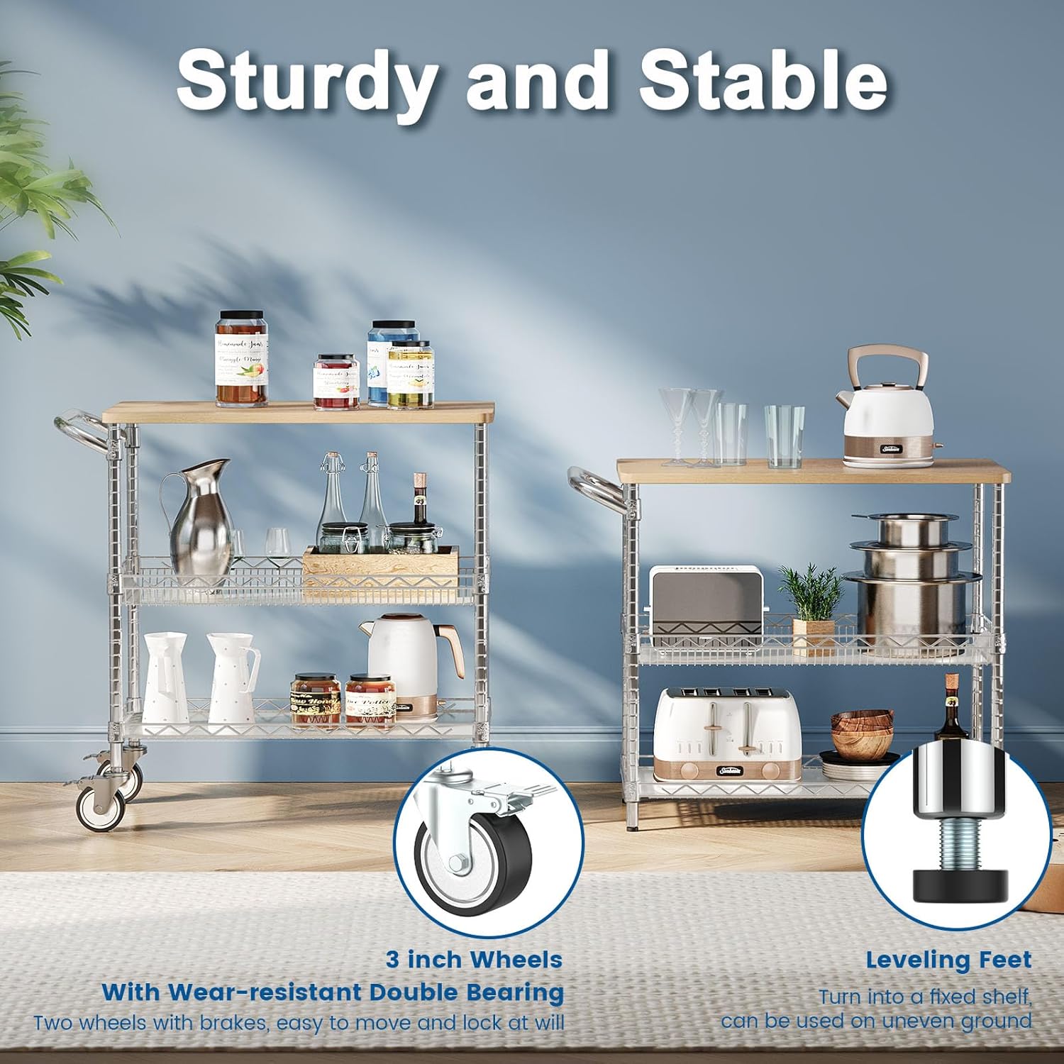 - Multifunctional Rolling Storage Cart: Comes with non-noise 4 wheels and leveling feet, our utility carts with wheels can also be used as kitchen storage carts, dining carts, service carts, tool carts, etc. Ideal for dining rooms, kitchens, restaurants, garages, utility rooms, etc. Removable handle design and is easy to push to any place.