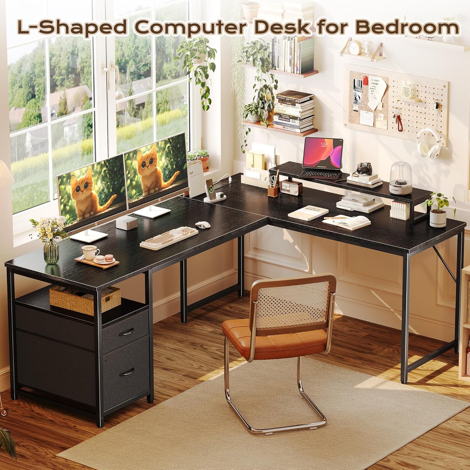PRAISUN 63 Inch L Shaped Desk with Power Outlets and USB-C Port, Computer Corner Home Office Desk with File Fabric Drawers and Movable Monitor Stand, Larger Storage, Gaming, Writing, Work, Black