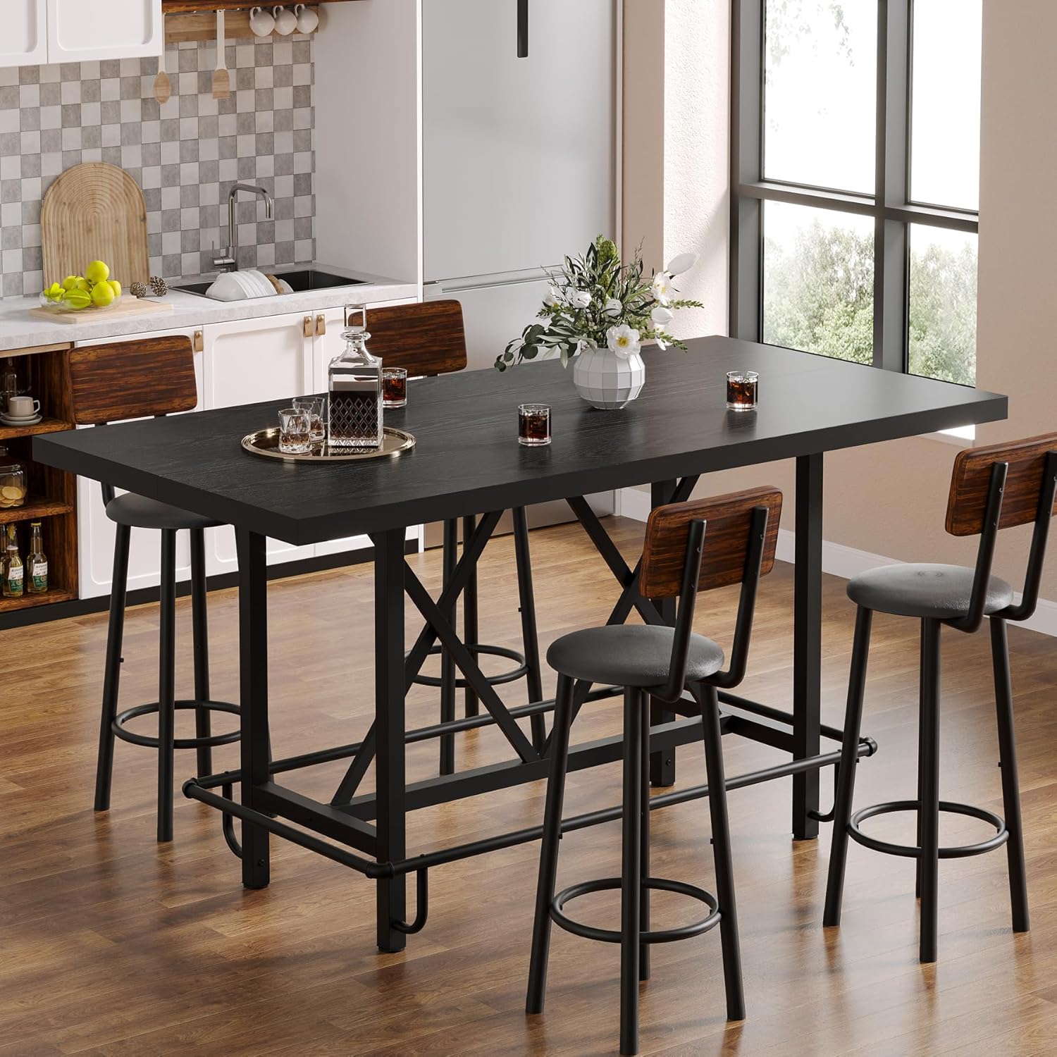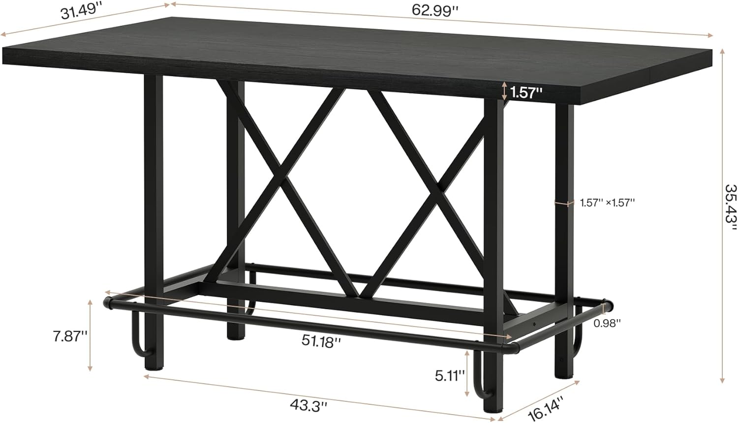 Tribesigns Bar Table, Industrial Counter Height Pub Table with Metal Footrest, 63-Inch Rectangle Wood Kitchen Dining Table with Sturdy Metal Frame for Dining Room, Home Bar (Black)