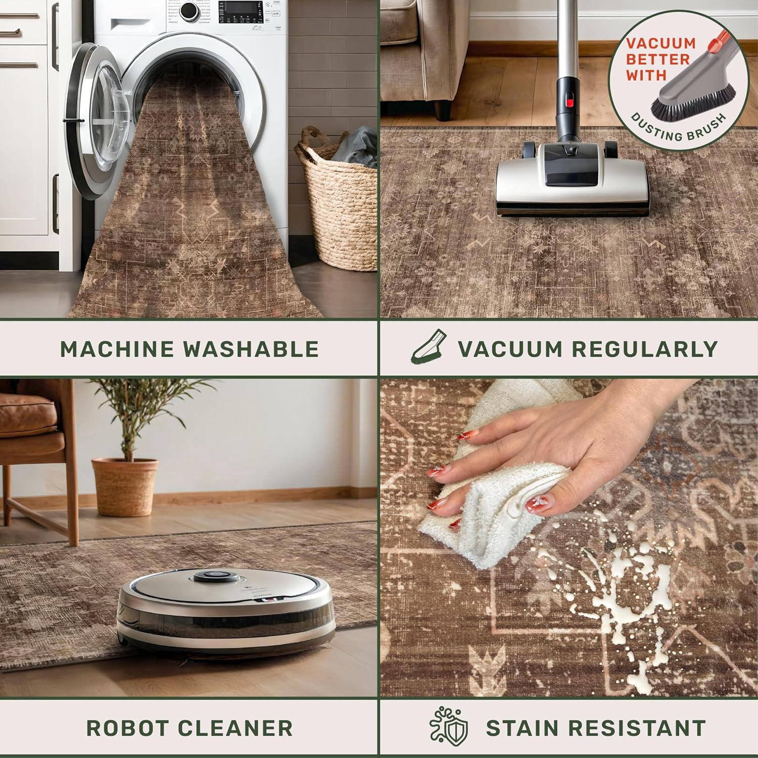 - Thoughtful Details: While folded rugs may arrive creased, simply roll them out and allow time for the fibers to settle. Vacuuming with a soft brush and gently machine-washing in cold water will help maintain its pristine appearance
