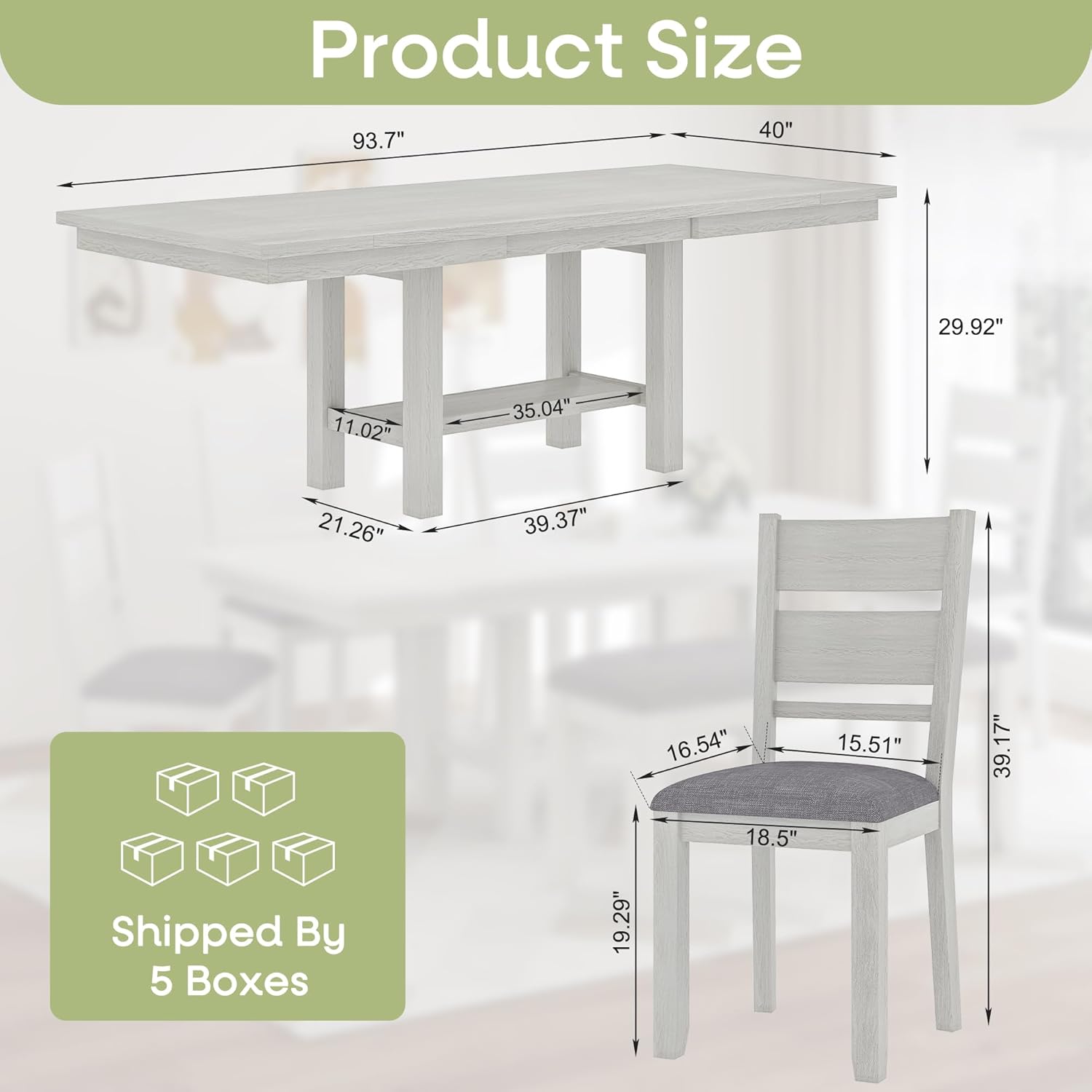 7-Piece Solid Wood Dining Table Set for 6, Extendable Table with 6 Chairs – Easy Assembly for Indoor Use, Kitchen, Dining Room, Grey