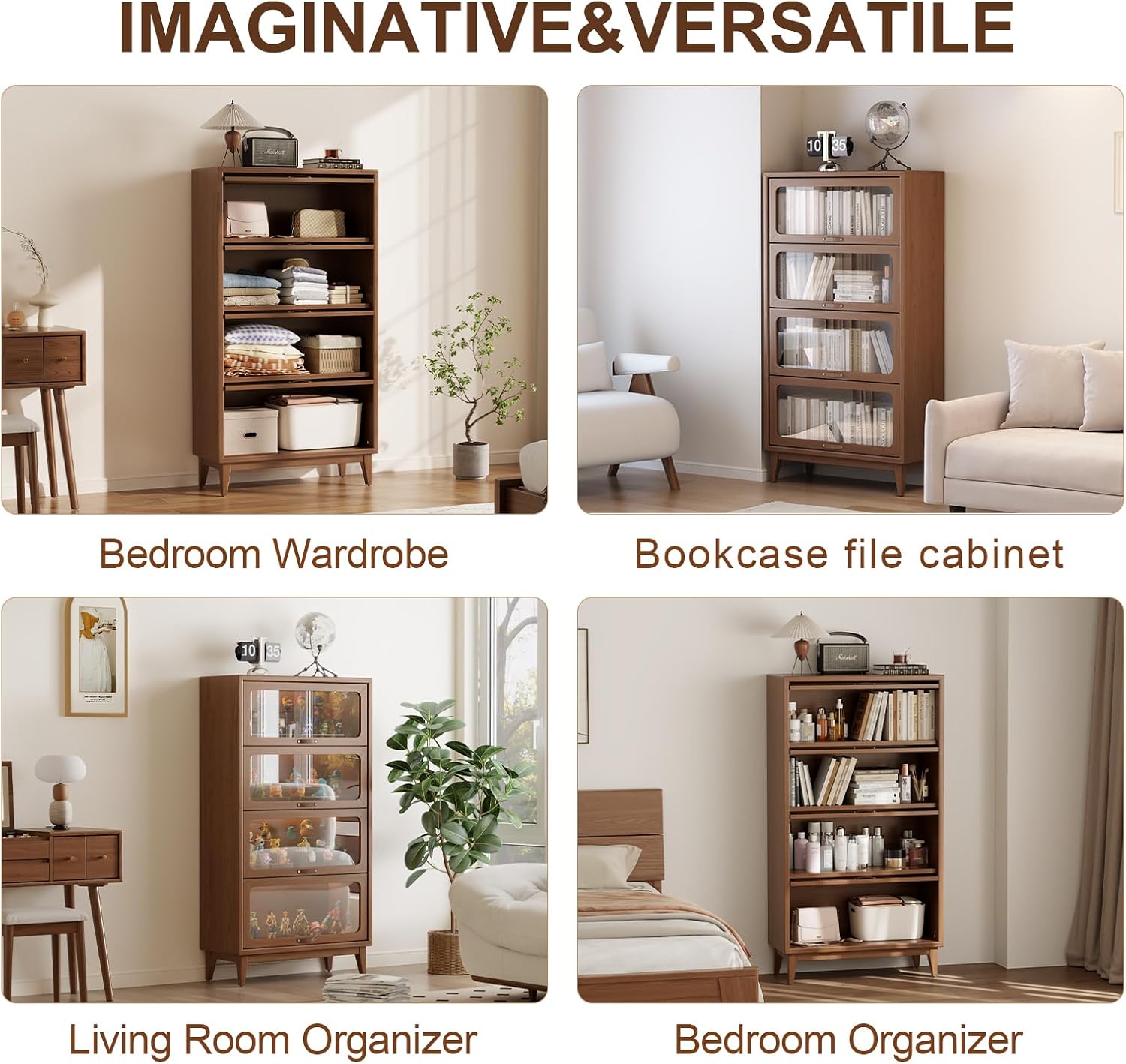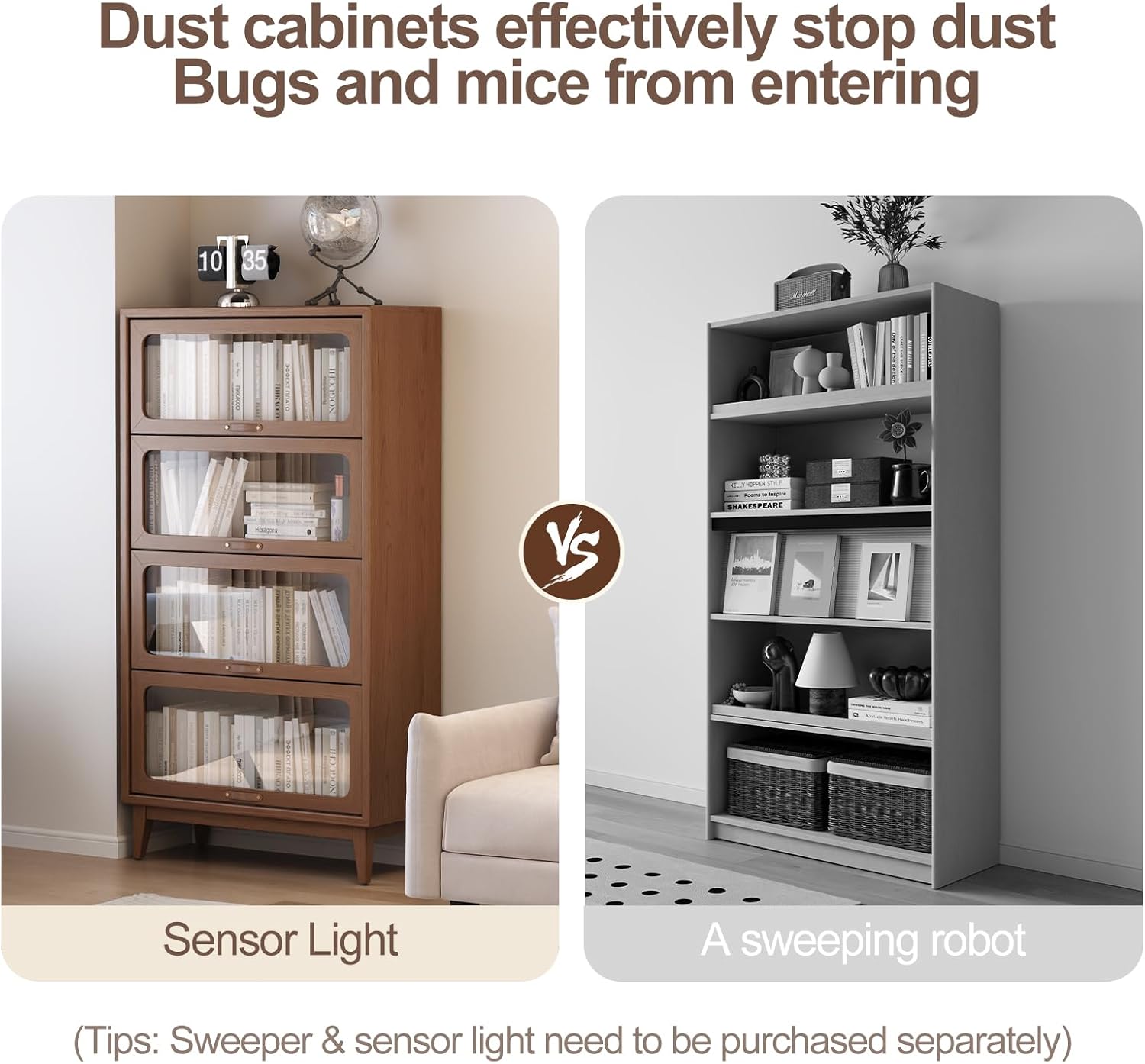 Solid Wood Bookcase 4-tire with Tempered Glass Flip-Up Doors,60Hx32Dx13.7W Bookshelves Finish Cube Storage Organizer,Bookshelf Versatile Pantry Cabinet for Living Room Home Office