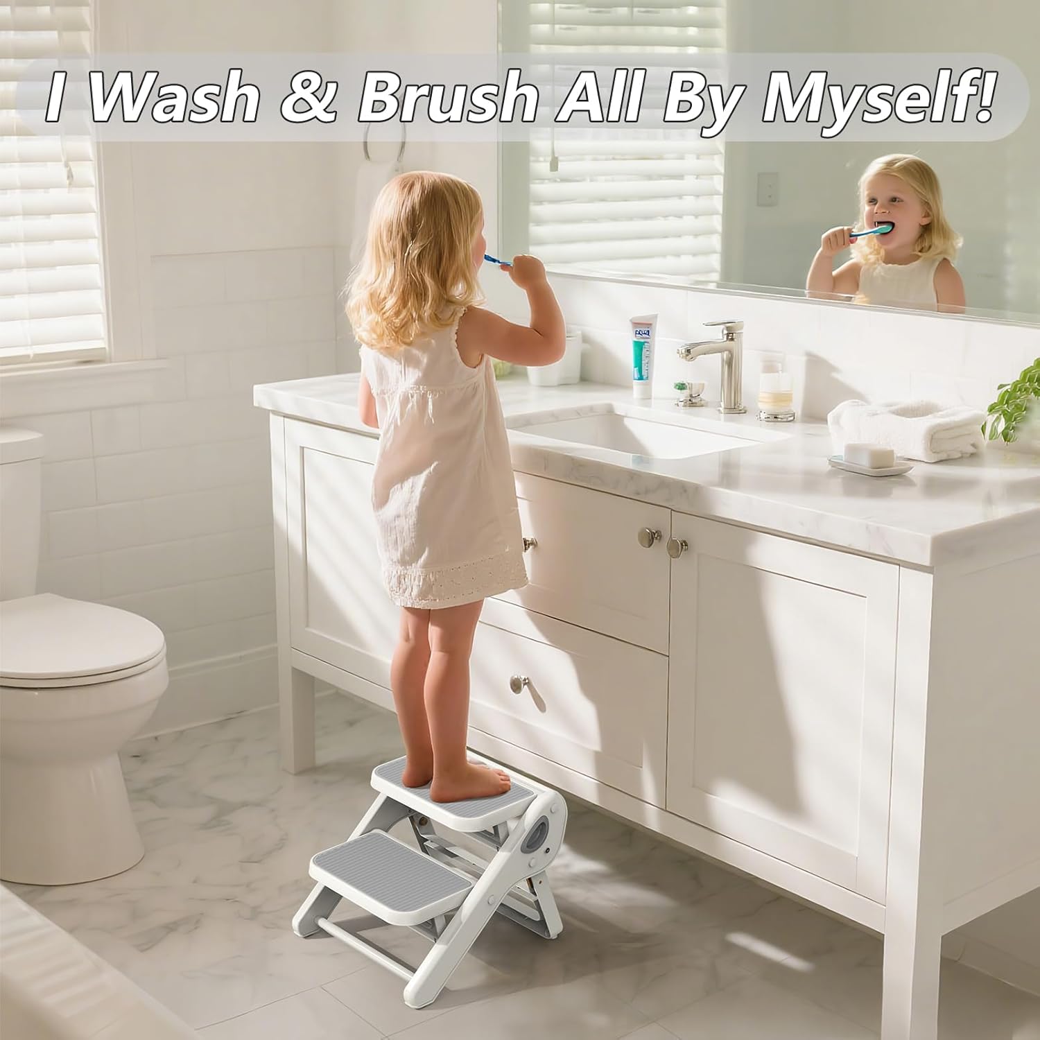 Toddler Step Stool, iNeibo 2-Step Foldable Step Stool for Kids, Widened & Thickened with Anti-Slip Design, Safer for Children Use for Kitchen, Bathroom, Toilet Training - Gray