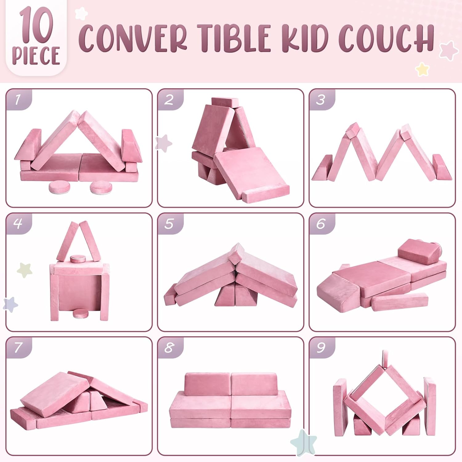 10Pcs Kids Play Couch,Toddler Sofa,Modular Kids Couch for Playing, Creativing, Sleeping (Pink)