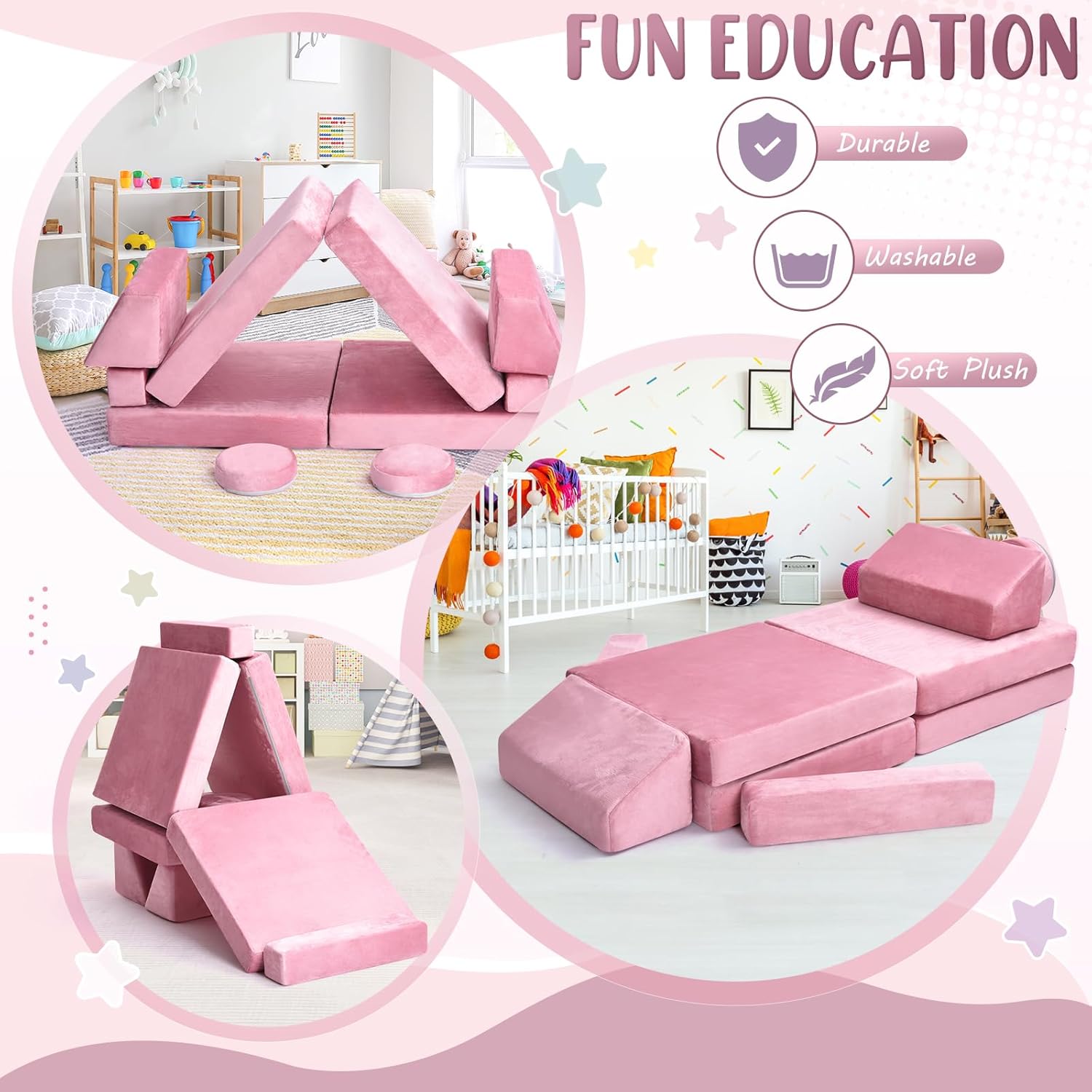- High Quality and Safety: Our modular kids sofa couch is made high-quality sponge, which is highly elastic,safety, very soft and light.The kids sofa couch can be used as a chair, fort, tunnel, mat, couch, sofa, or anything you want it to be