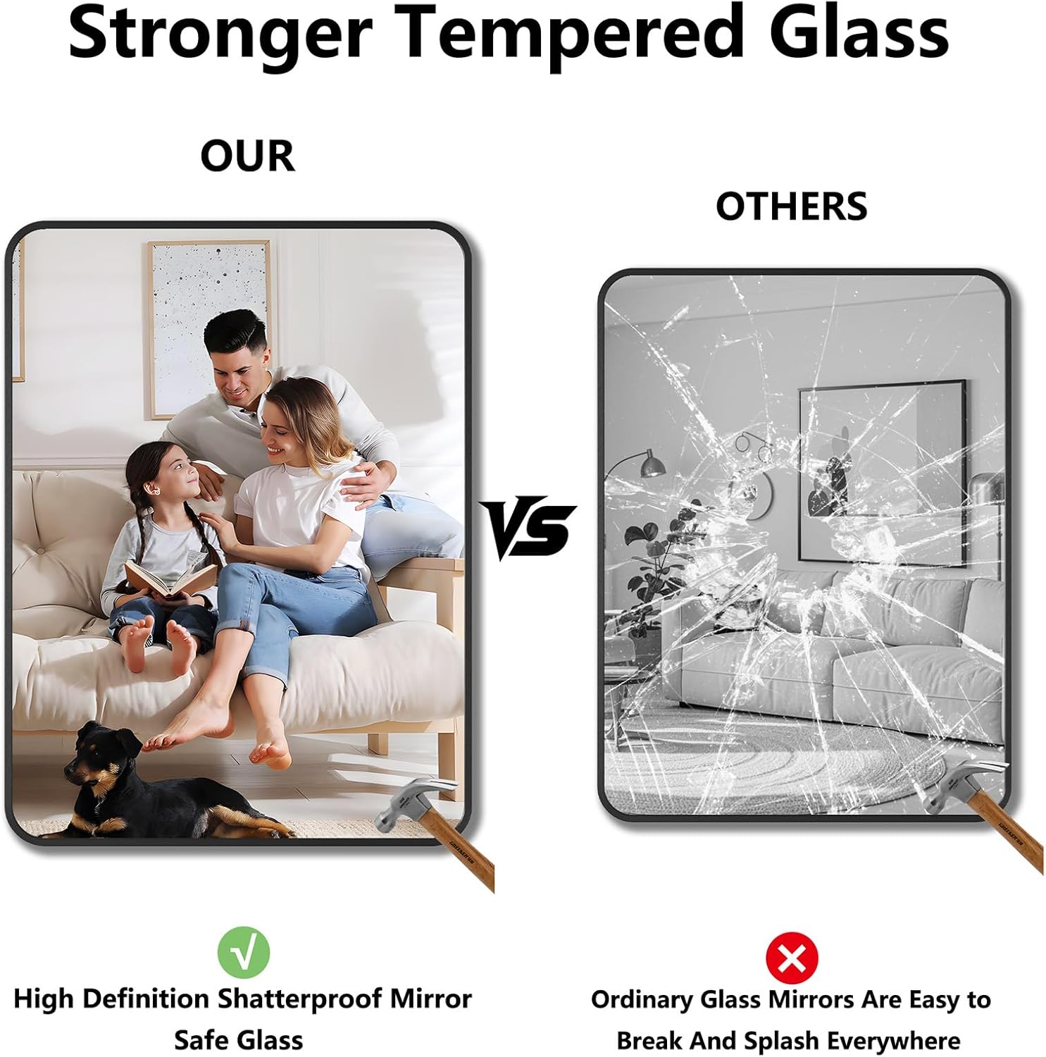 - Safe & Secure Tempered Glass: Built with shatterproof tempered glass and rust-resistant aluminum frame, this wall mirror for bathroom mounts securely above sinks. Steam-proof design withstands daily showers and heavy use—zero cracks, rust, or warping. Sleek, reliable, and perfect for high-traffic bathrooms: clear reflections, durable protection.