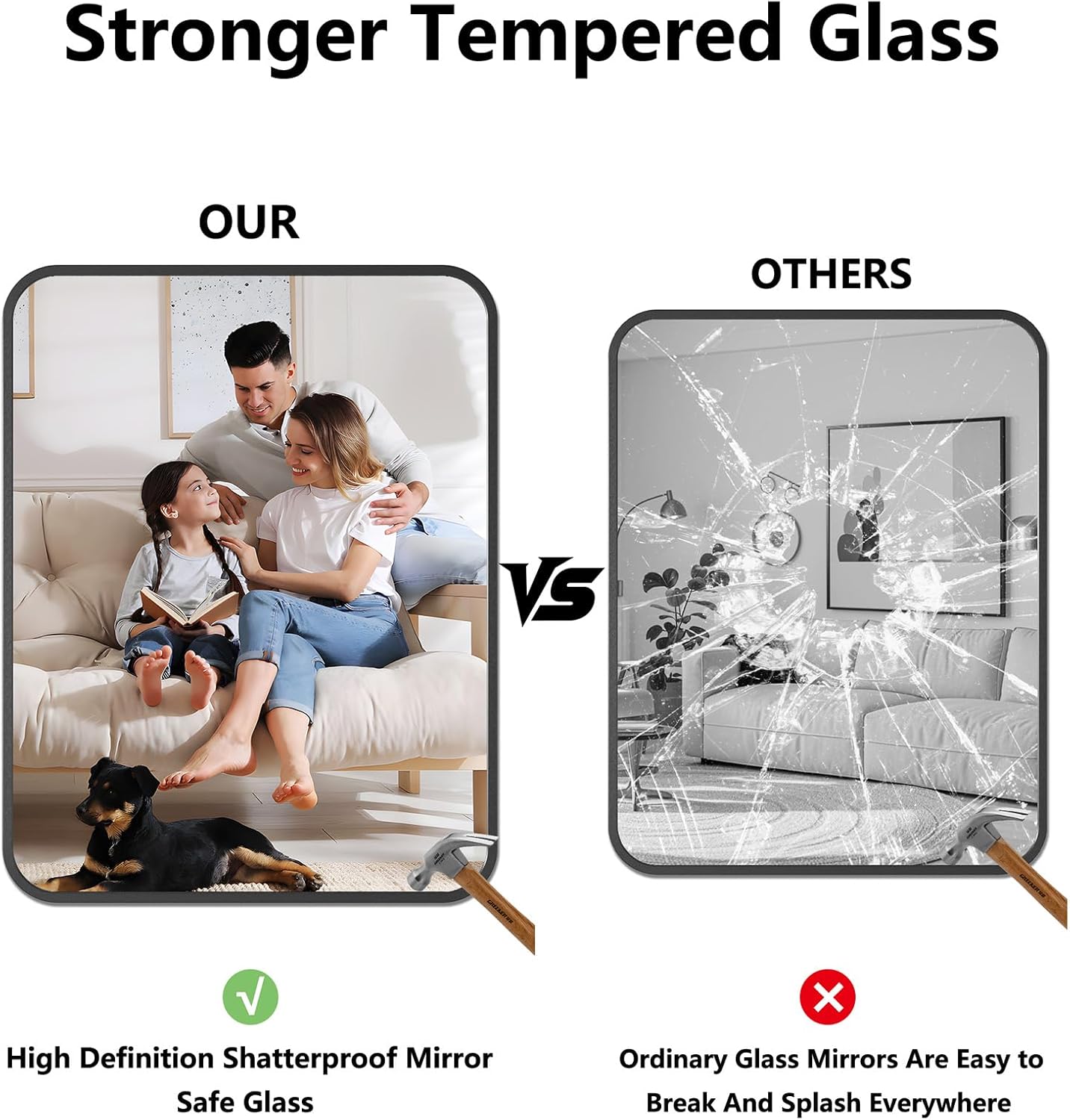 - Safe & Secure Tempered Glass: Built with shatterproof tempered glass and rust-resistant aluminum frame, this wall mirror for bathroom mounts securely above sinks. Steam-proof design withstands daily showers and heavy use—zero cracks, rust, or warping. Sleek, reliable, and perfect for high-traffic bathrooms: clear reflections, durable protection.