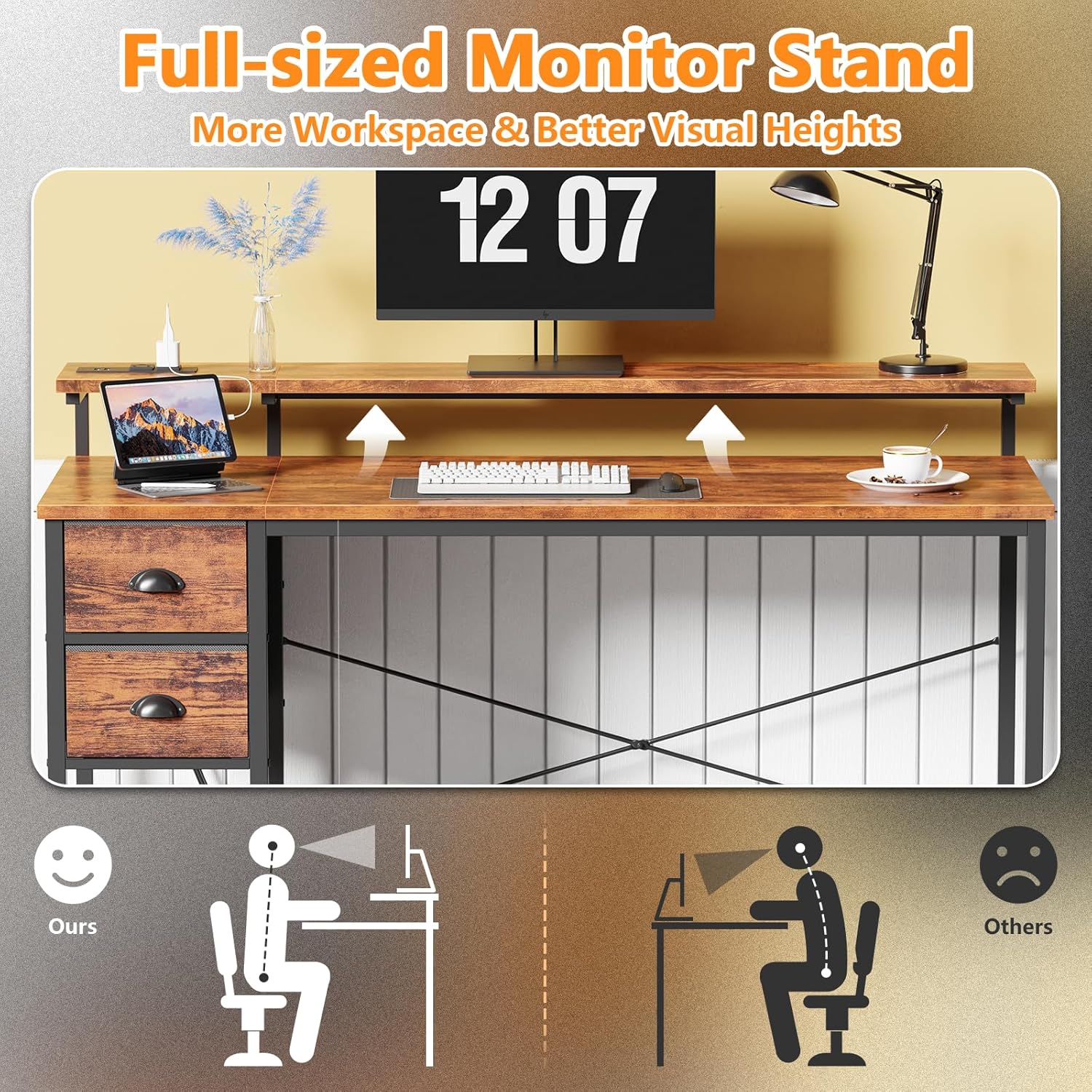 55 Inch Computer Desk with Power Outlets & LED Lights, Home Office Desk with Storage Drawers and Monitor Stand, Writing Work Study Desk for Bedroom Living Room