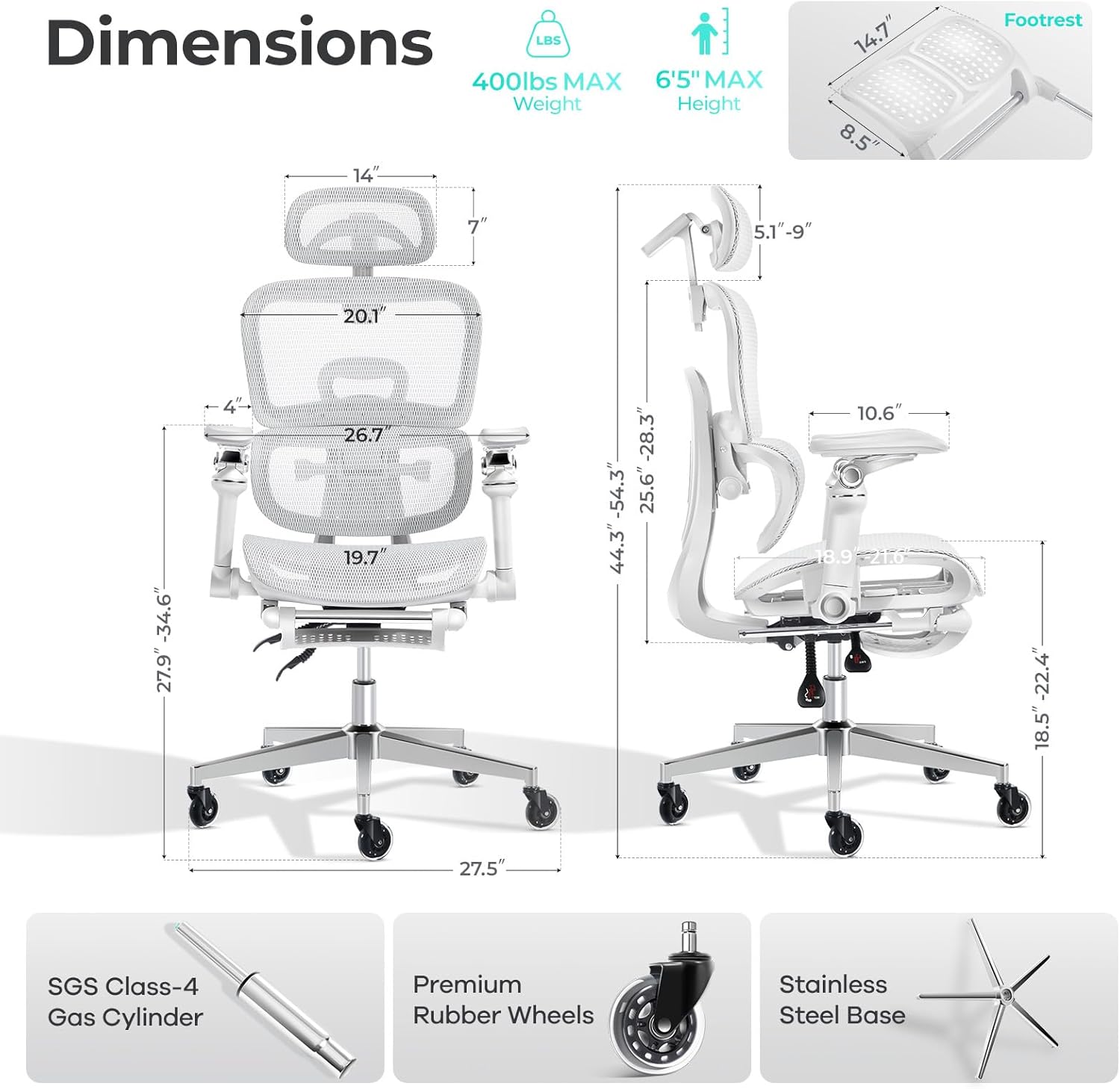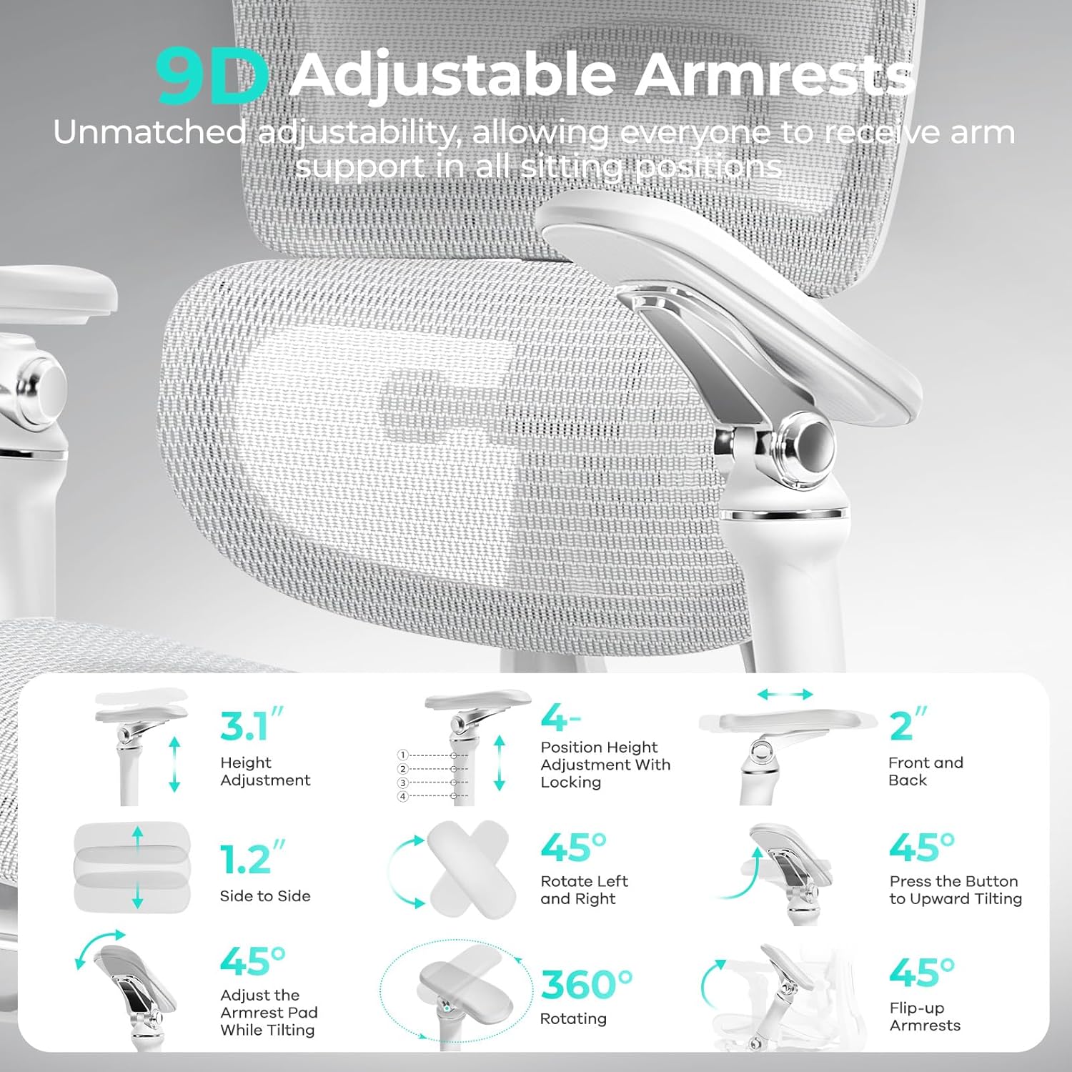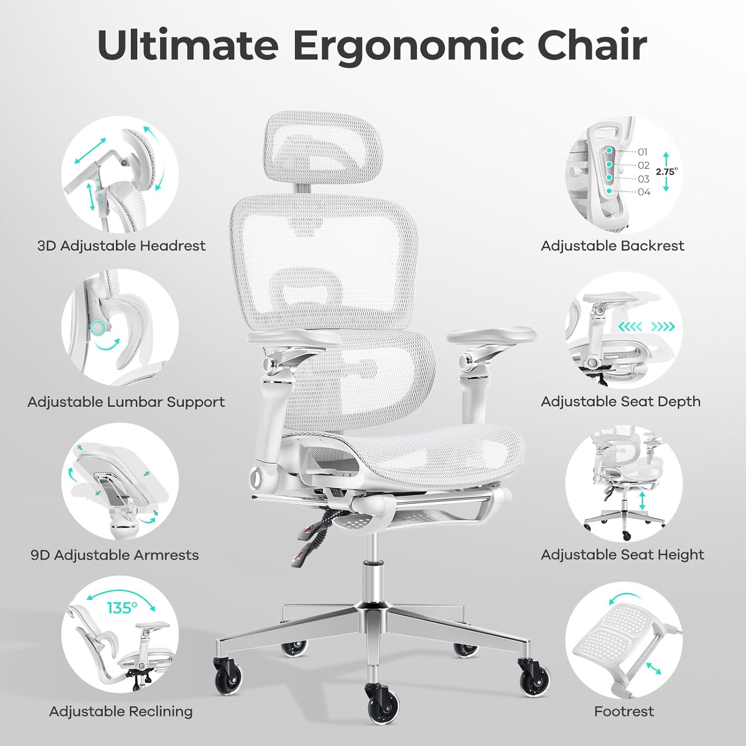 Ergonomic Office Chair with 9D Arms,Adjustable Seat Depth,3D Lumbar Support,135° Recline,3D Headrest & Footrest,Mesh Computer Desk Chair - Ultimate Comfort for Home & Executive Office White
