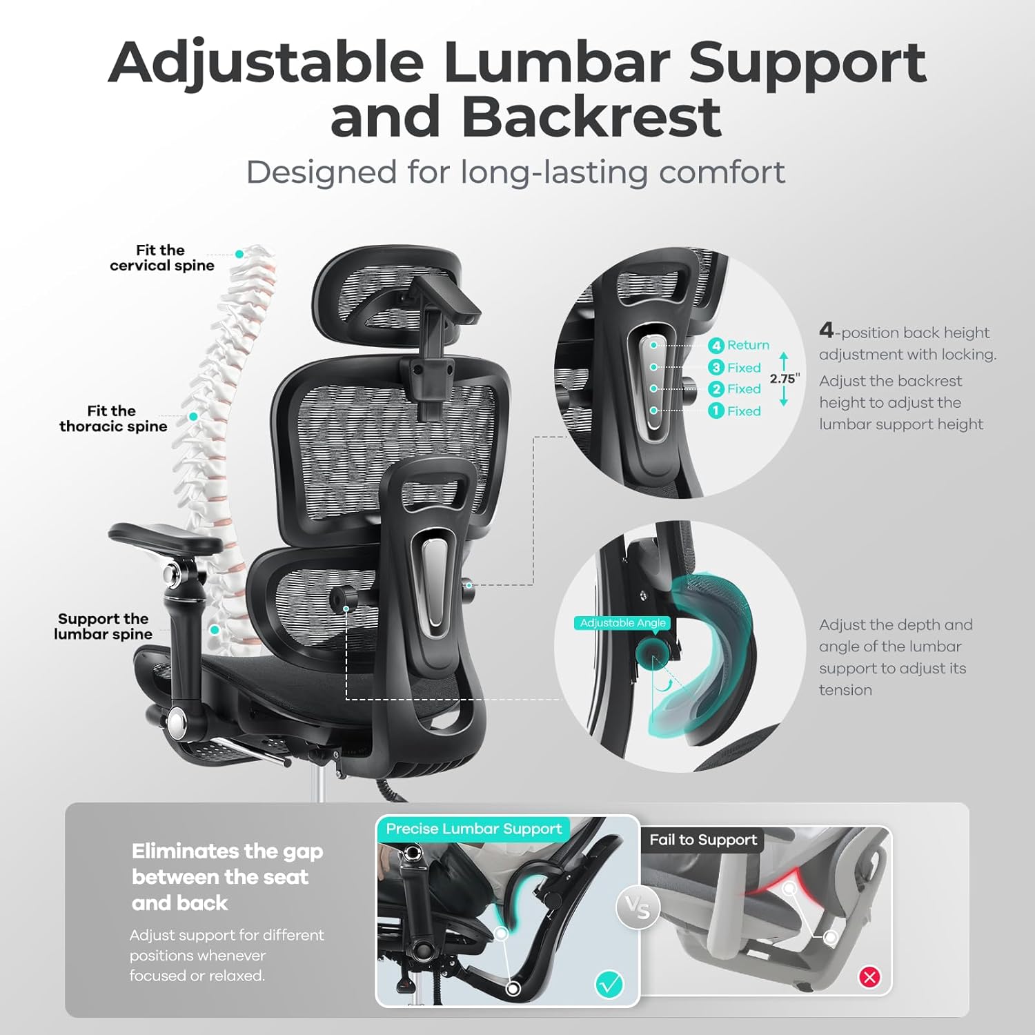 - [Adjustable Lumbar Support & Backrest Height]:Our adjustable lumbar support precisely contours to your spine and truly relieve your back pain.Rotate the buttons on both sides to adjust the angle of the lumbar support and control its elasticity .The backrest and lumbar support features 4 height-adjustable positions with locking. You can adjust 4 different heights and lock them. When adjusted to the highest, the locked height will be reset. Our split back design ensures that your lower back can be supported well while sitting, lying down, and in any posture.