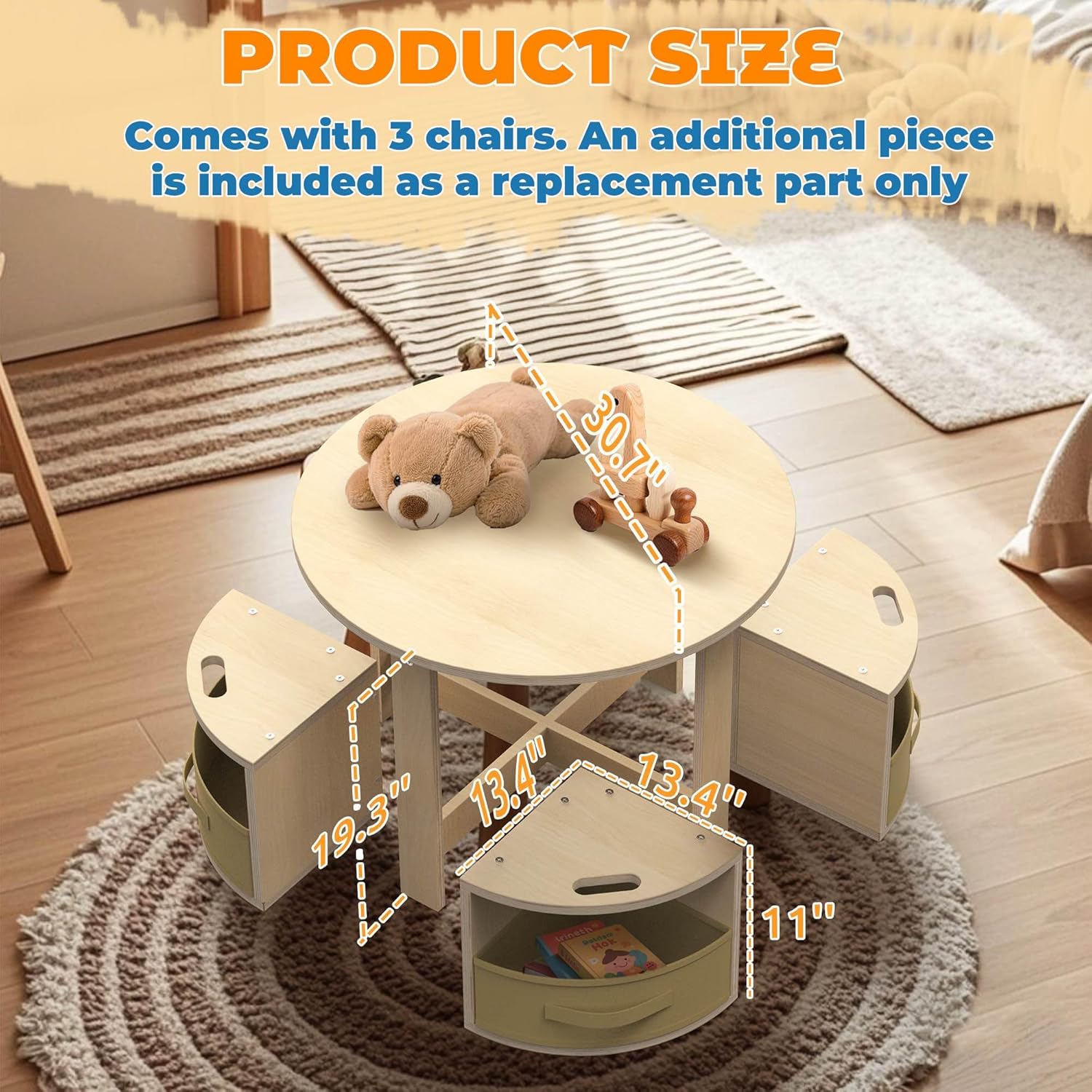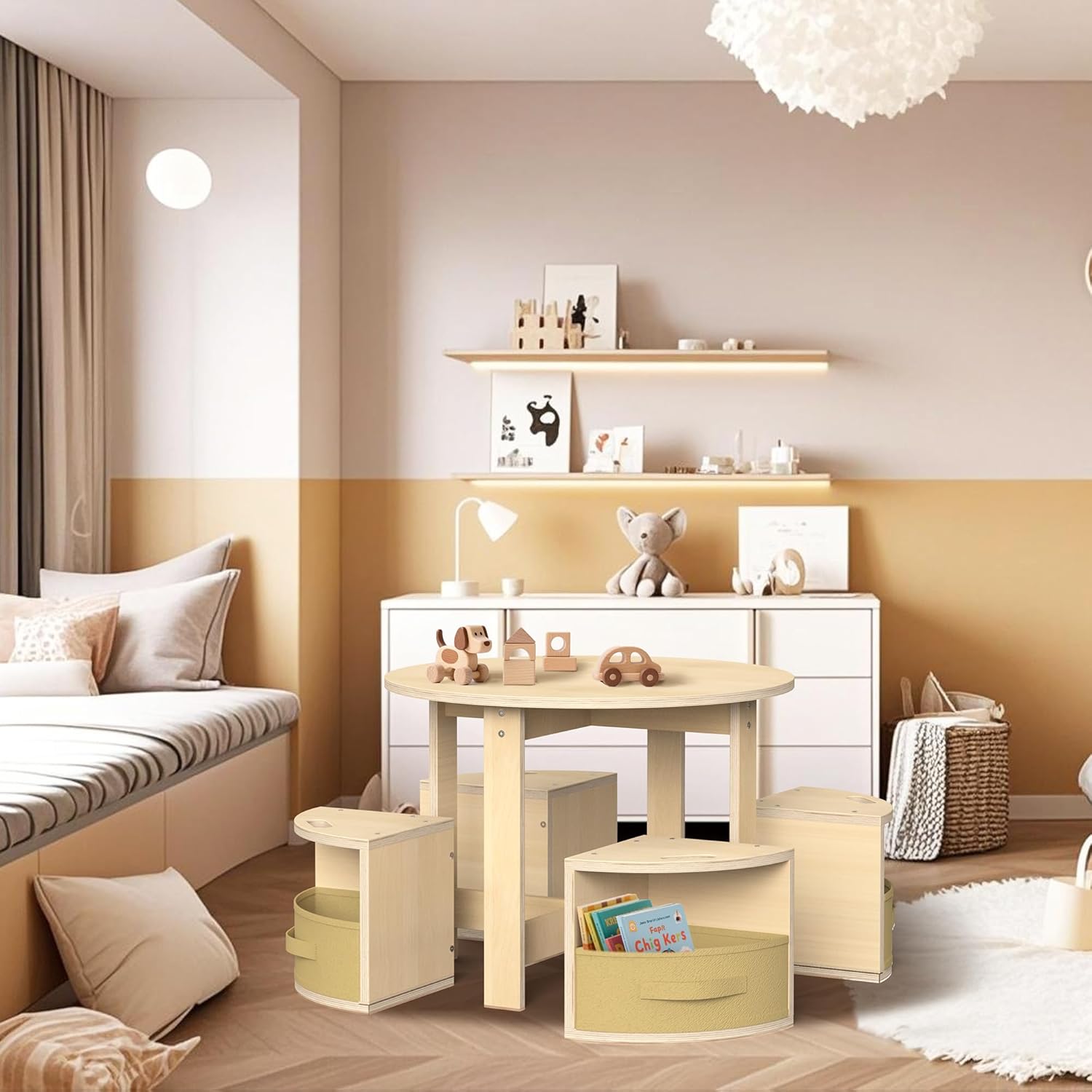 Toddler Table and Chair Set with 3 Storage Stools, Round Shaped Nesting Design, Kids Activity Table for Play/Art/Reading/Craft, Natural