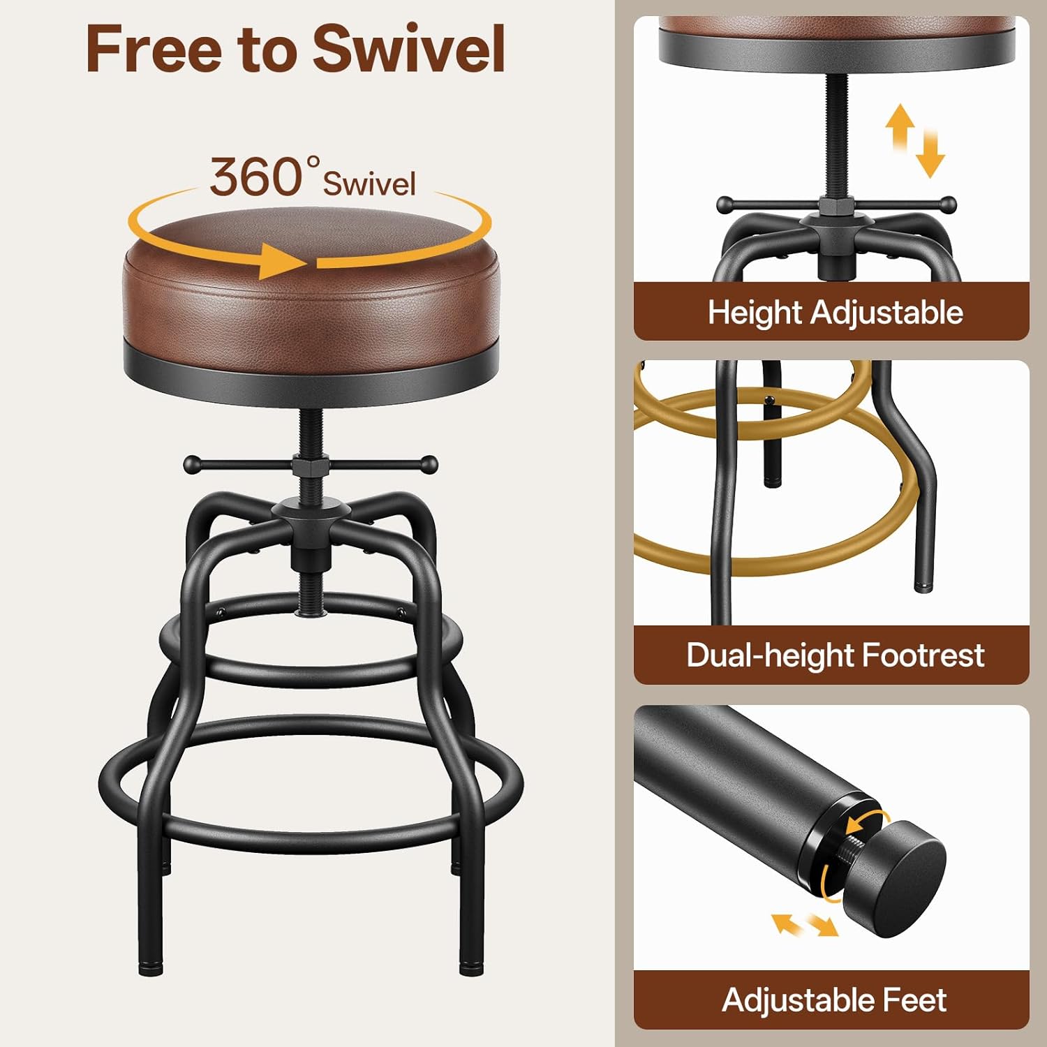 Adjustable Height Swivel Bar Stools Set of 2, 22-29 Inch Industrial Vintage Bar Counter Height Stools with Thicken Premium Bonded Leather Seats & Updated Footrests, Easy Assembly, Brown