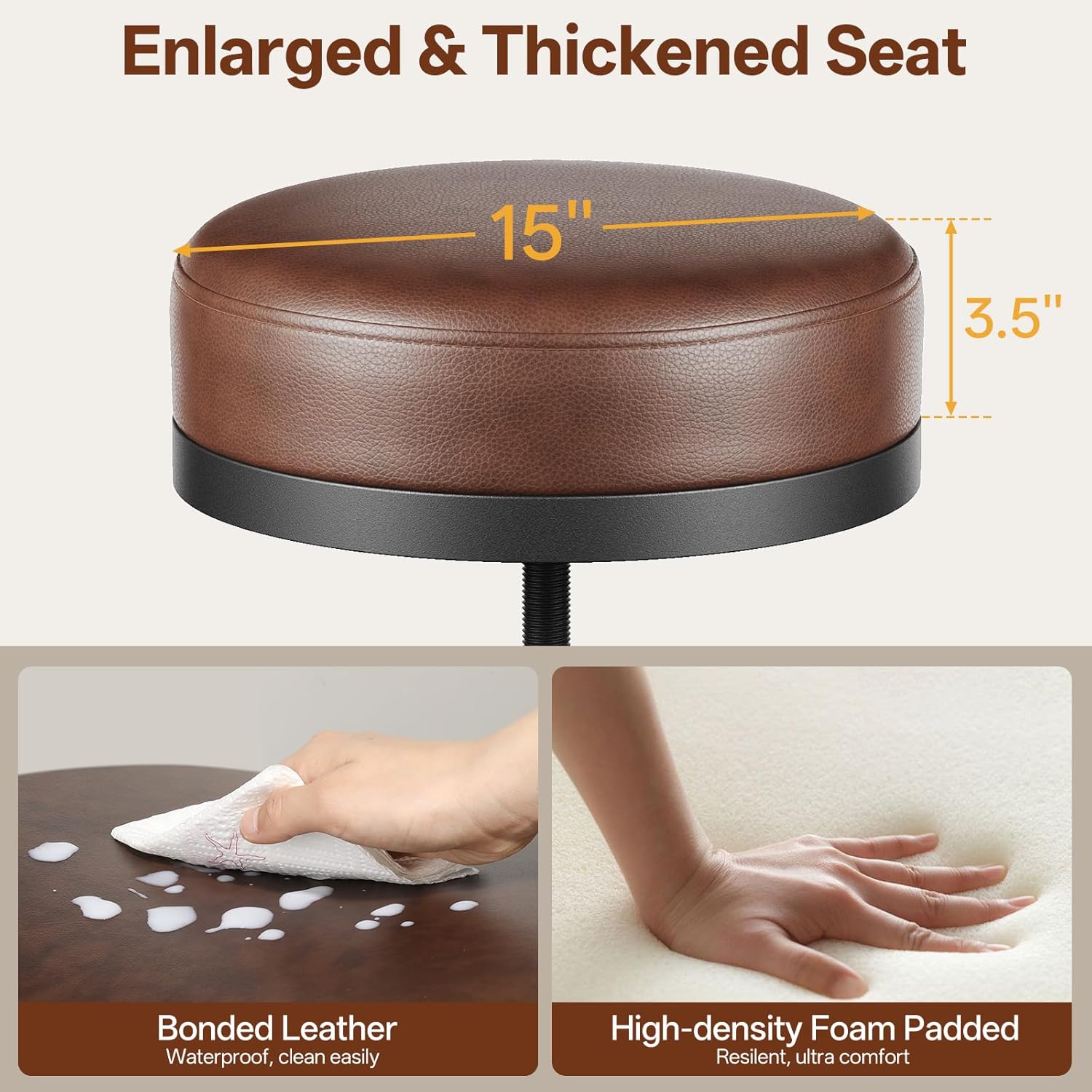 - Timeless Design Meets Enhanced Seating Comfort: Crafted in industrial-inspired aesthetics, these backless bar stools combine rugged durability with ergonomic comfort. The 14.5-inch oversized seat and 3.5-inch bonded leather cushion provide expansive support, reducing hip pressure and ensuring lasting comfort. The bonded leather upholstery offers a sleek, easy-to-clean surface that is resistant to spills and wear, while its high-density foam core prevents sagging even with prolonged use.