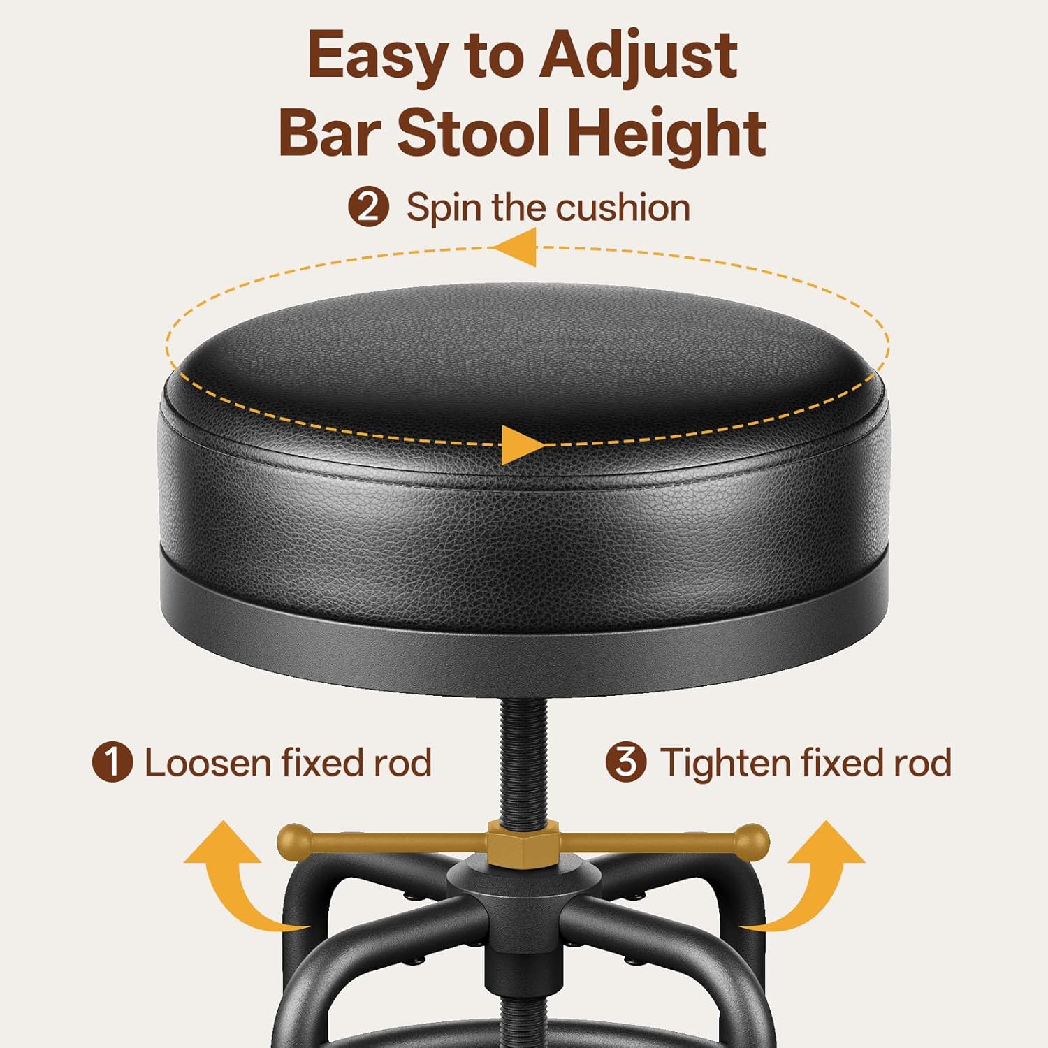 Adjustable Height Swivel Bar Stools Set of 3, 22-29 Inch Industrial Vintage Bar Counter Height Stools with Thicken Premium Bonded Leather Seats & Updated Footrests, Easy Assembly, Black