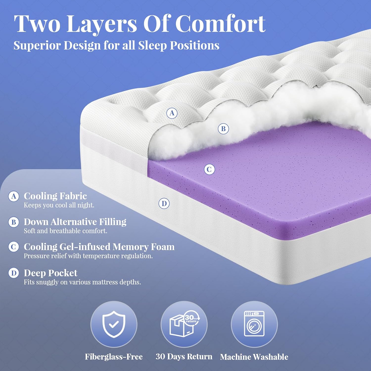 - Secure Fit for Various Mattress Heights: The elastic deep-pocket skirt fits mattresses up to 19" thick, keeping the topper firmly in place without shifting. Compatible with most mattress types, including memory foam, hybrid, innerspring, and more