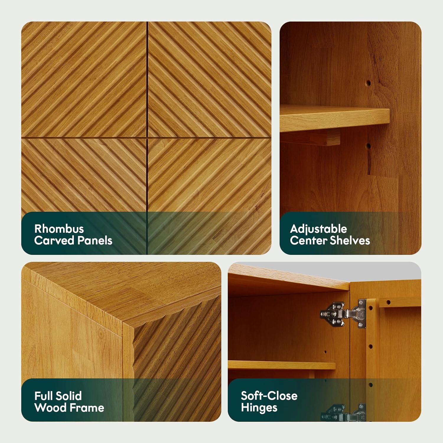 Bme Rhombus Wooden TV Stand with Storage Cabinets – Solid Acacia Wood, Geometric Rhombus Pattern Doors, Scandinavian Modern Entertainment Console with Metal Base