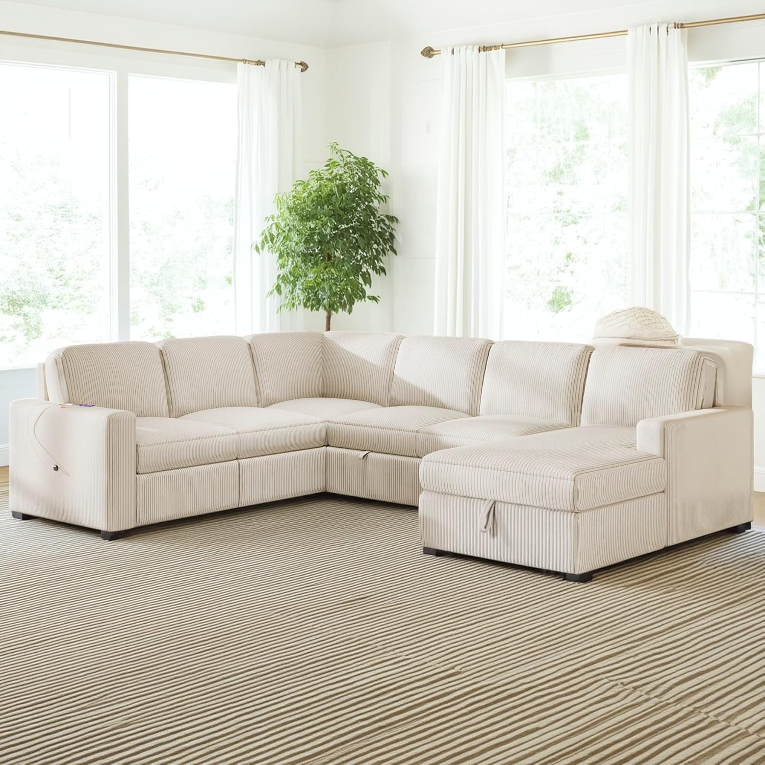 115.6 Inch U-Shaped Modular Sectional Sofa with Pull Out Bed, Storage Chaise and USB interfaces, Oversized Upholstered Combination Corner Couch for Living Room, Office, Spacious Space, Beige