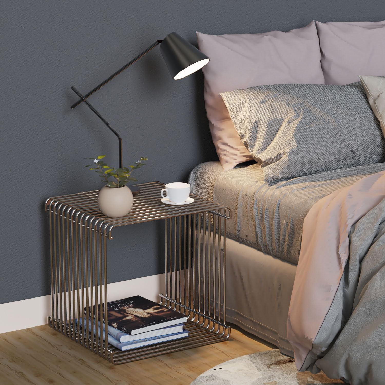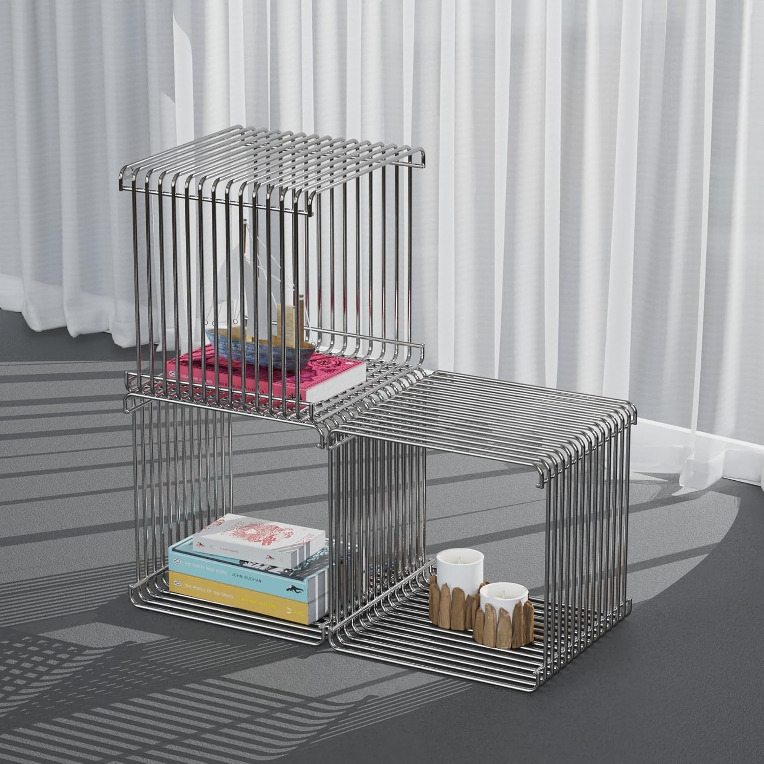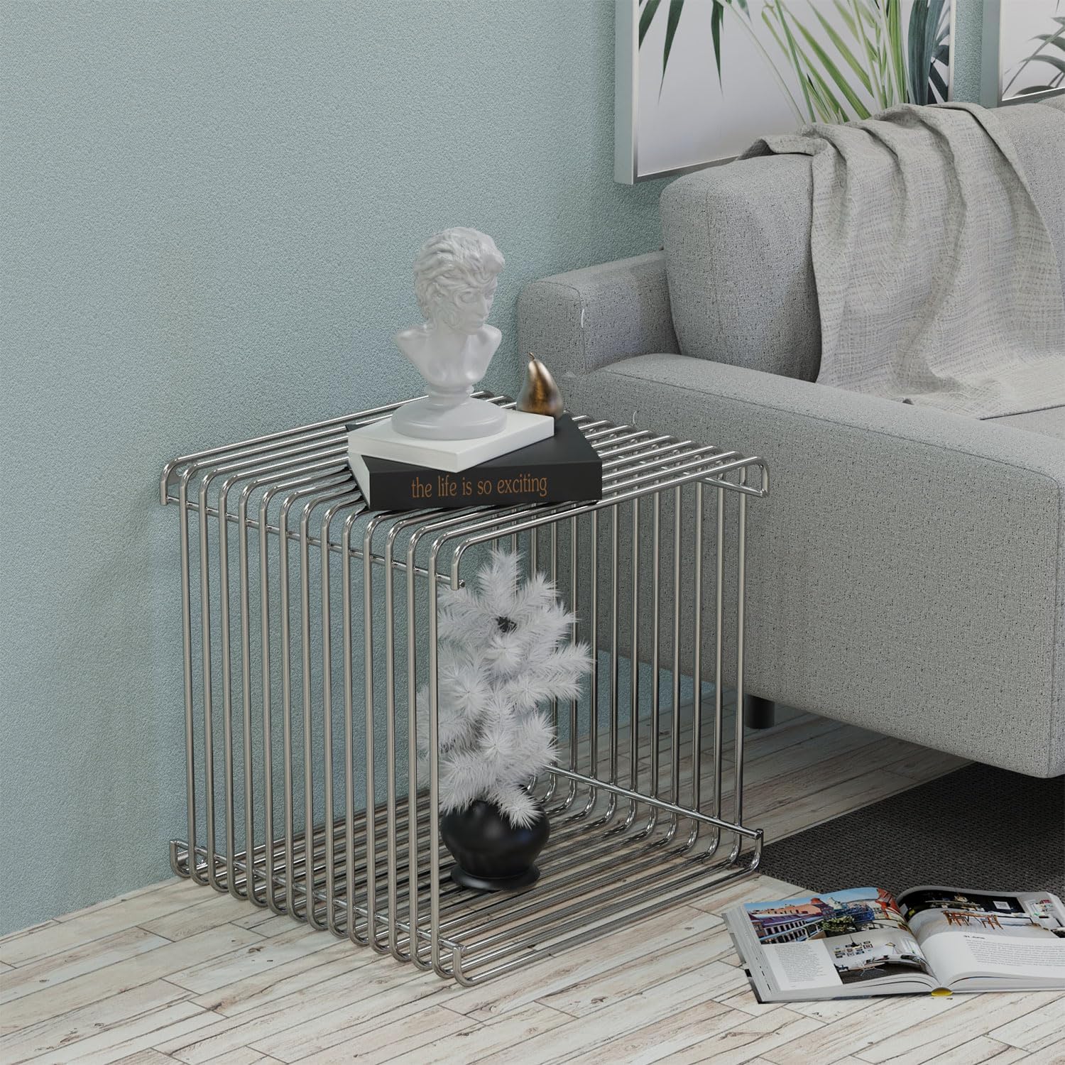 Square Geometry Retro Side Table Prime-Stainless Steel Linear Metal End Table, Iron Multi-Purpose Desktop Shelf (Silver)