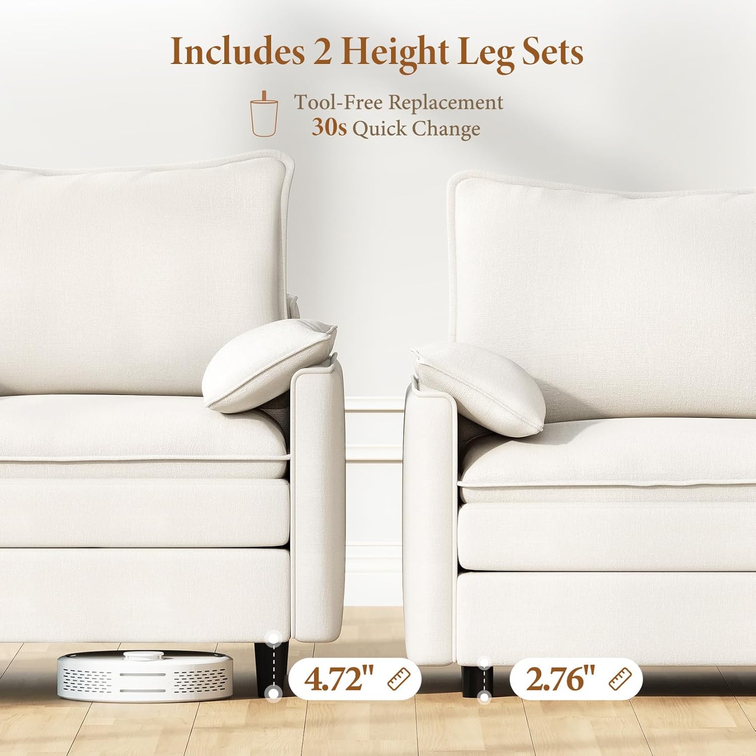 - Two Sets of Sofa Legs & Effortless Assembly: This sectional couch comes with two leg height options—2.76" and 4.72"—so you can customize the height to suit your preference. Choose the lower height for a relaxed look, or the higher height for easier access, which also allows robot vacuums to clean underneath with ease. Assembly is simple: with clear instructions and all the necessary tools included, you can have it setup in just 30 minutes with no extra equipment required