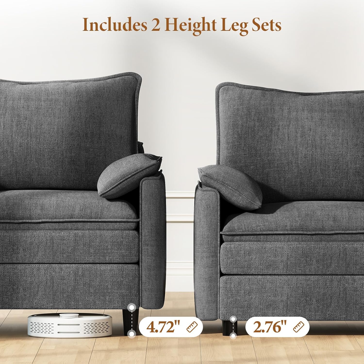 - Two Sets of Sofa Legs & Effortless Assembly: This 4 seater couch comes with two leg height options—2.76" and 4.72"—so you can customize the height to suit your preference. Choose the lower height for a relaxed look, or the higher height for easier access, which also allows robot vacuums to clean underneath with ease. Assembly is simple: with clear instructions and all the necessary tools included, you can have it setup in just 30 minutes with no extra equipment required