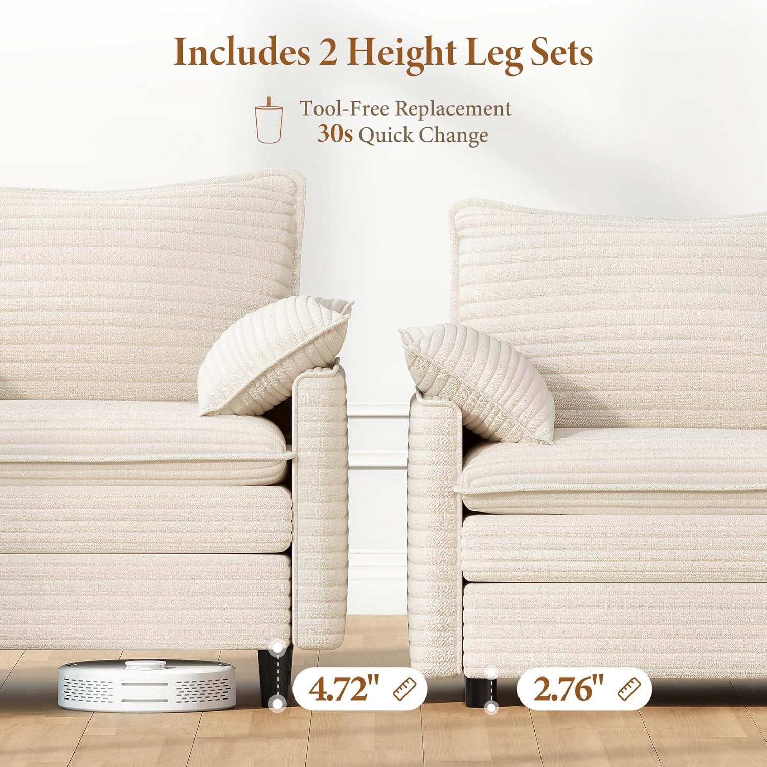 - Two Sets of Sofa Legs & Effortless Assembly: This cloud sectional couch comes with two leg height options—2.76" and 4.72"—so you can customize the height to suit your preference. Choose the lower height for a relaxed look, or the higher height for easier access, which also allows robot vacuums to clean underneath with ease. Assembly is simple: with clear instructions and all the necessary tools included, you can have it setup in just 30 minutes with no extra equipment required