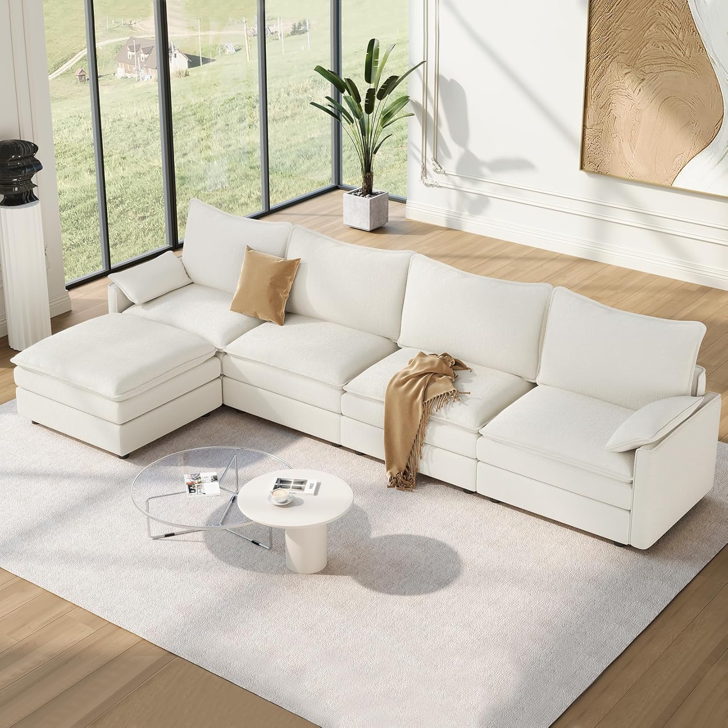 Vesgantti 142" Cloud Couch Sectional Modular Sofa, Comfy Sectional Couch with Ottoman Deep Seat Chenille L Shaped Sofa, Modular Couches for Living Room, Bedroom and Apartment, Snow White
