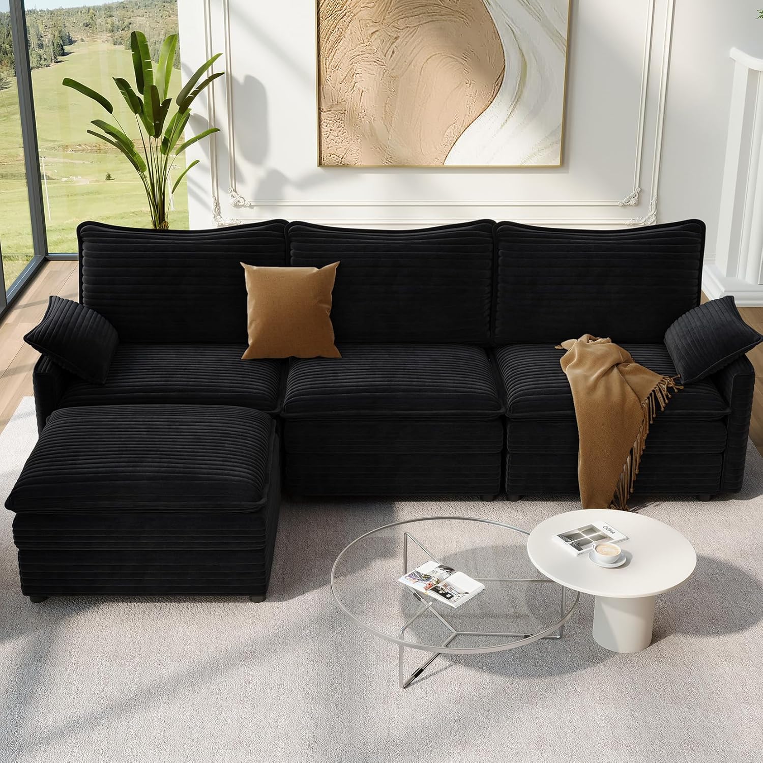 Vesgantti 108" Modular Sectional Sofa, Comfy Cloud Couch with Movable Ottoman Deep Seat Corduroy L Shaped Modular Sofa, Sectional Couches for Living Room, Bedroom and Apartment, Black