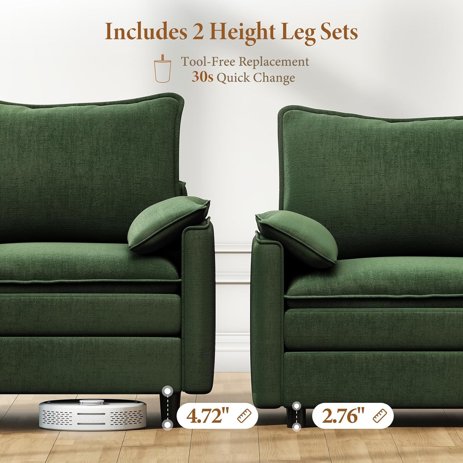 - Two Sets of Sofa Legs & Effortless Assembly: This sectional couch comes with two leg height options—2.76" and 4.72"—so you can customize the height to suit your preference. Choose the lower height for a relaxed look, or the higher height for easier access, which also allows robot vacuums to clean underneath with ease. Assembly is simple: with clear instructions and all the necessary tools included, you can have it setup in just 30 minutes with no extra equipment required