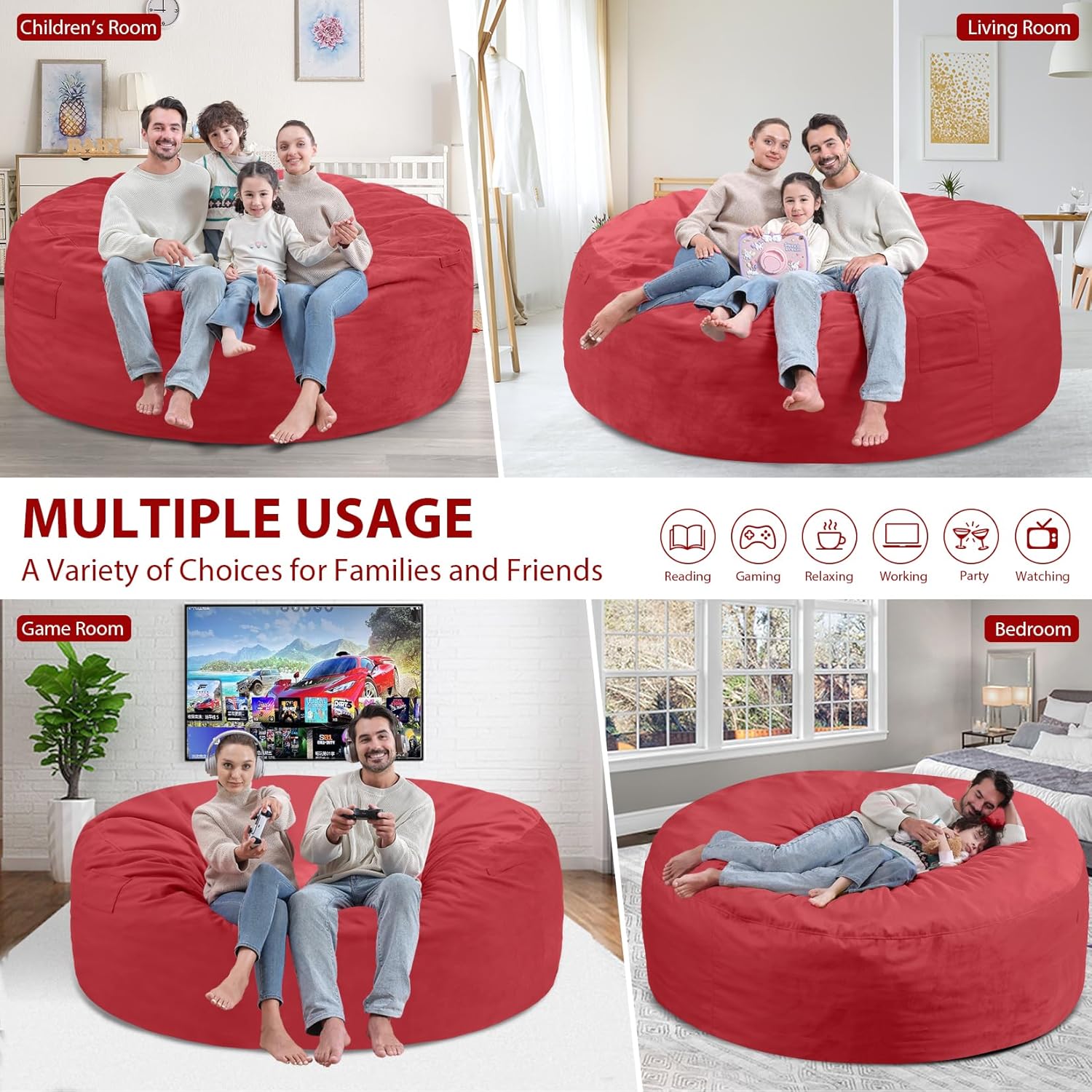 6FT Bean Bag Chair, Large Bean Bag Chairs with Memory Foam Filled, Fluffy Beanbag Sofa with Dutch Velvet Cover, Round BeanBag Chairs for Living Room, Playroom - Red
