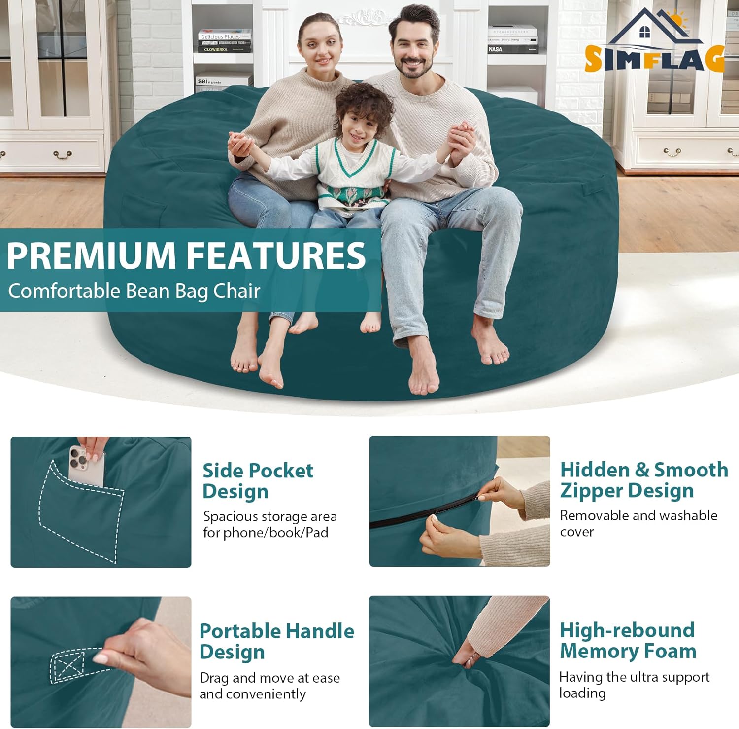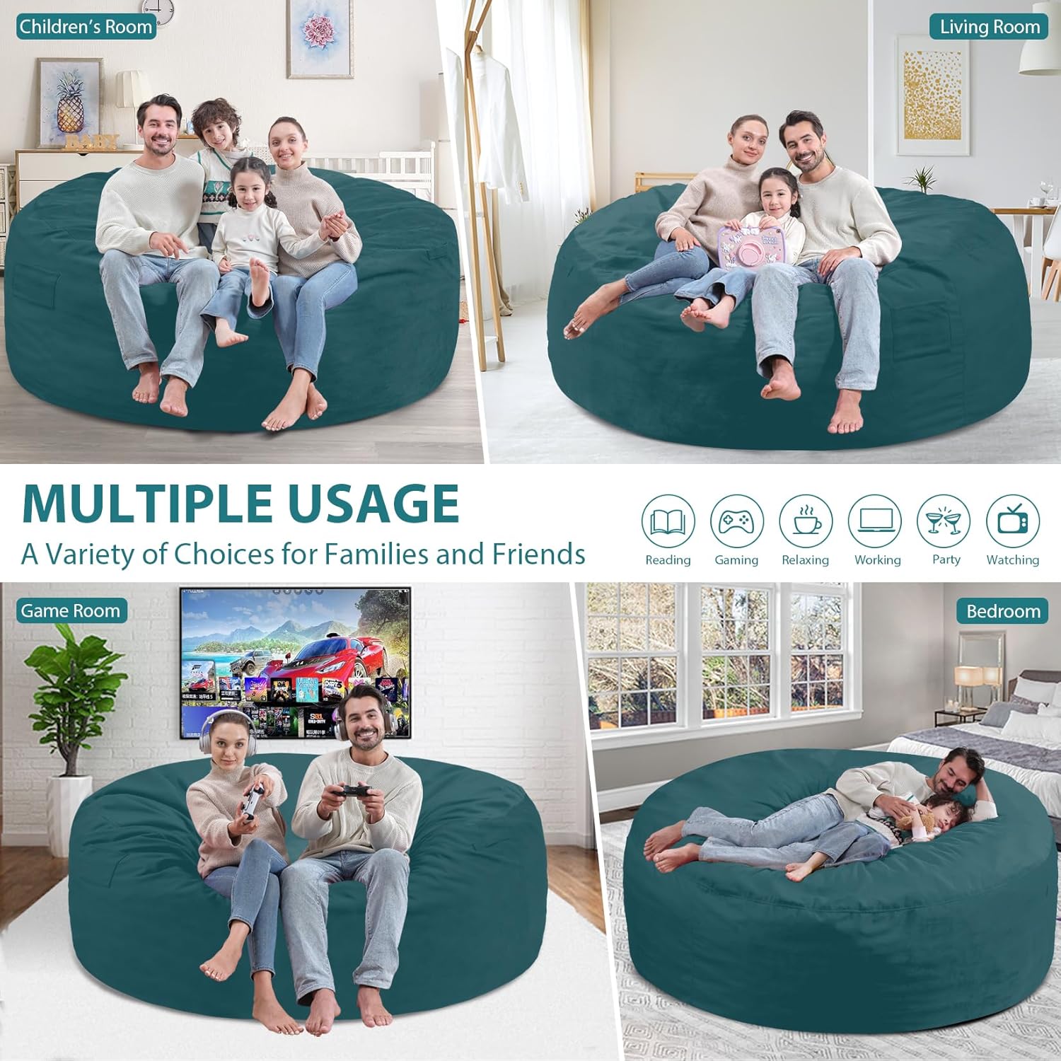 6FT Bean Bag Chair, Large Bean Bag Chairs with Memory Foam Filled, Fluffy Beanbag Sofa with Dutch Velvet Cover, Round BeanBag Chairs for Living Room, Playroom - Sea Blue