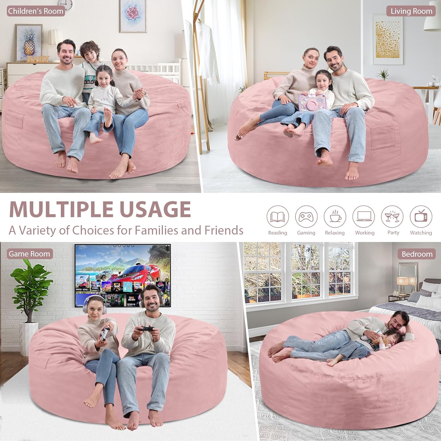 6FT Bean Bag Chair, Large Bean Bag Chairs with Memory Foam Filled, Fluffy Beanbag Sofa with Dutch Velvet Cover, Round BeanBag Chairs for Living Room, Playroom- Light Pink