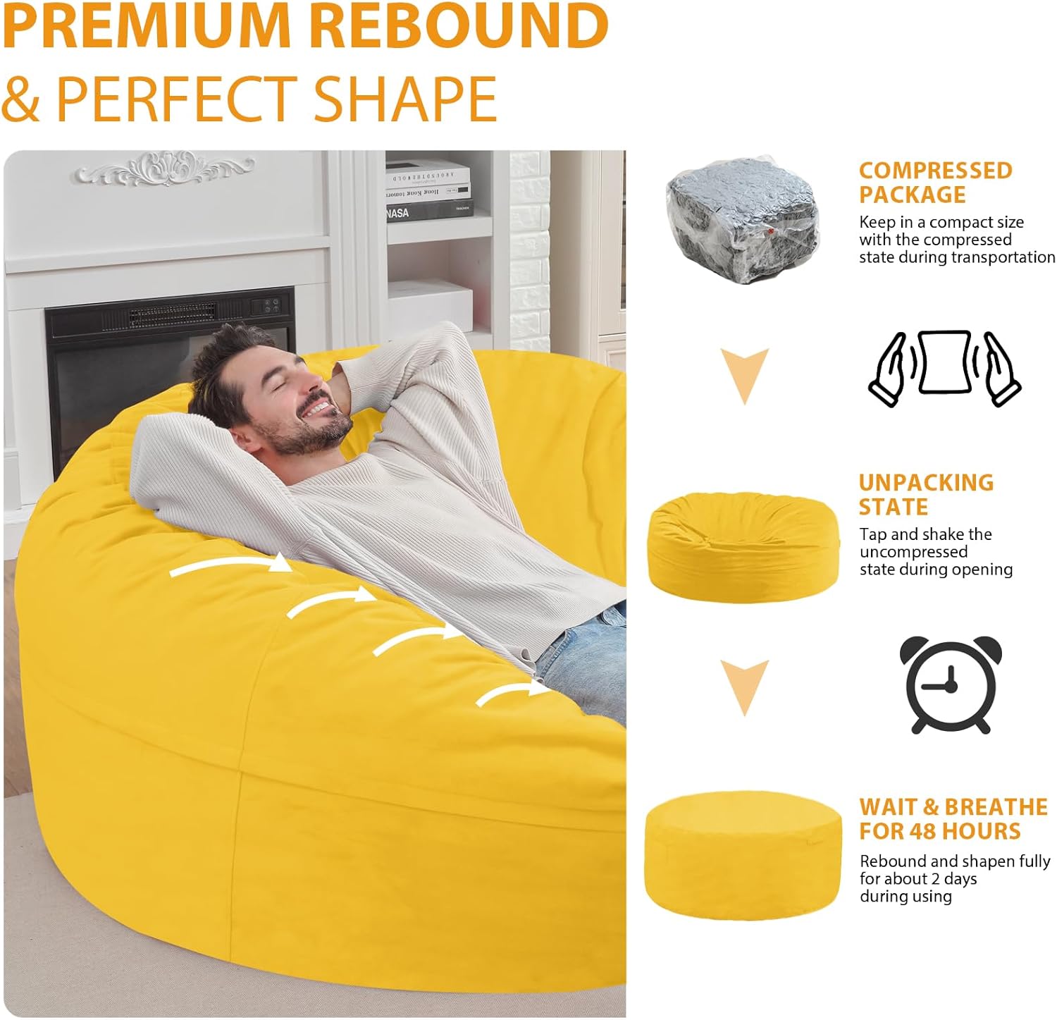 - MEMORY FOAM FILLING: Giant bean bag chair is filled with high rebound memory foam to provide you with comfort and fluffy support. Unlike other crushing foams, our memory foam bean bag chair can bounce back perfectly after use. Note: The bean bag chair is a compression package and need 2-3 hours to fluff it up for maximum comfort.