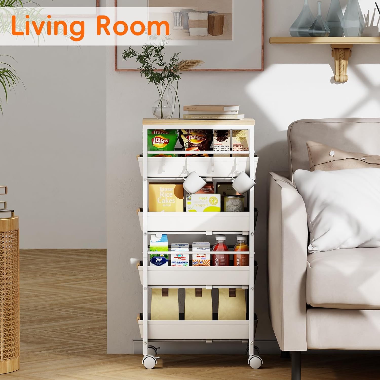 5-Tier Kitchen Storage Cart, Wood Top Rolling Cart Organizer with Pull-Out Baskets & Wheels, Metal Snack Cart with Holder for Fruit, Vegetable, Microwave, Kitchen, Pantry, White