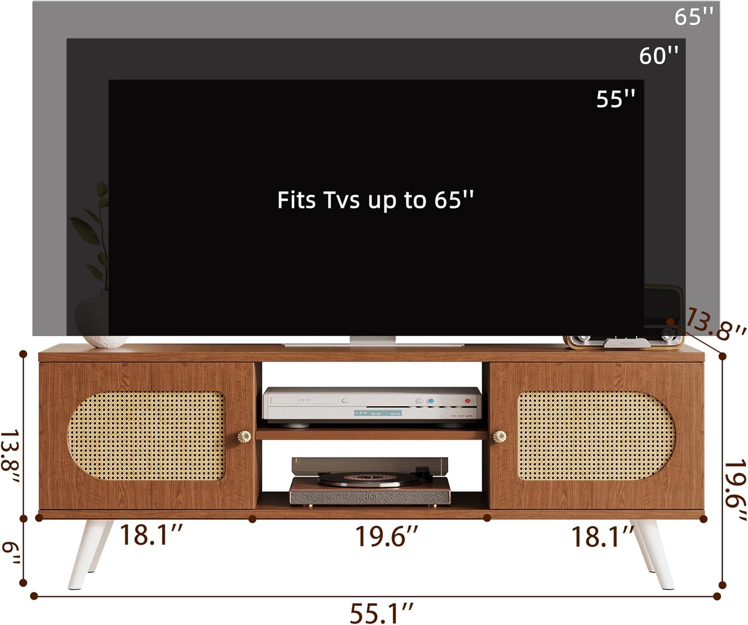 - Boho Rattan TV Stand: dimension 55.1"W x 13.78"D x 19.67"H. This entertainment center is made of high quality wood panels and can hold TVs up to 55 and 65 inches