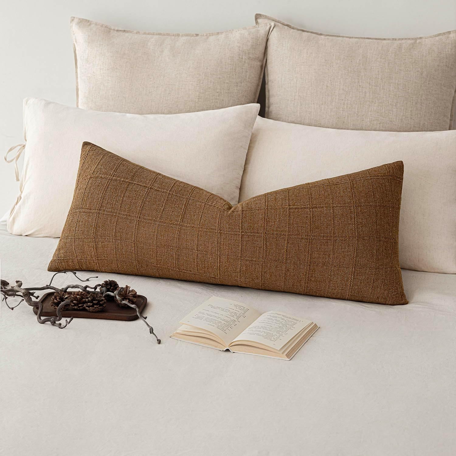 Foindtower Set of 2 Decorative Linen Check Throw Pillow Covers Neutral Long Body Lumbar Cushion Covers Farmhouse Vintage Boho Home Decor For Sofa Chair Couch Bedroom Living Room,14×36 Inch,Brown Hazel