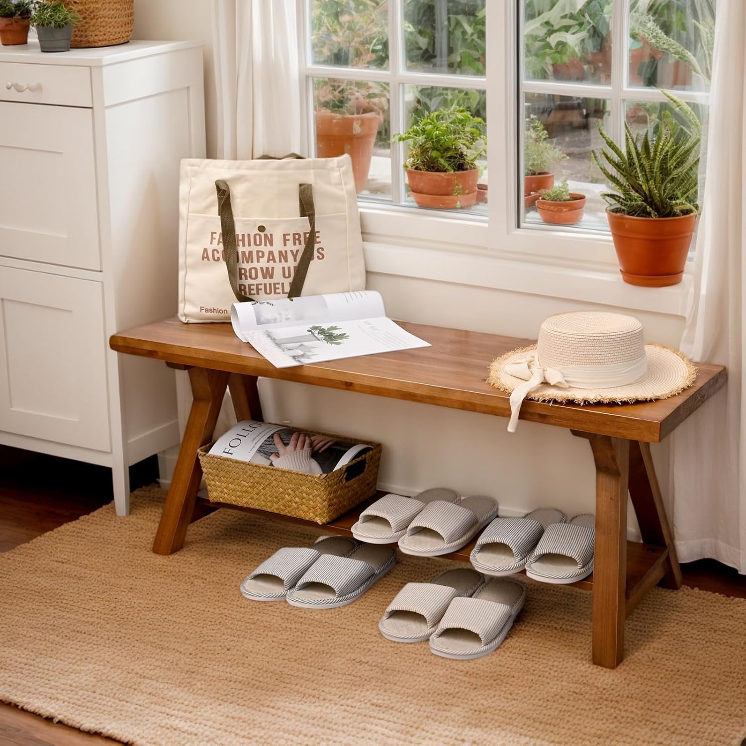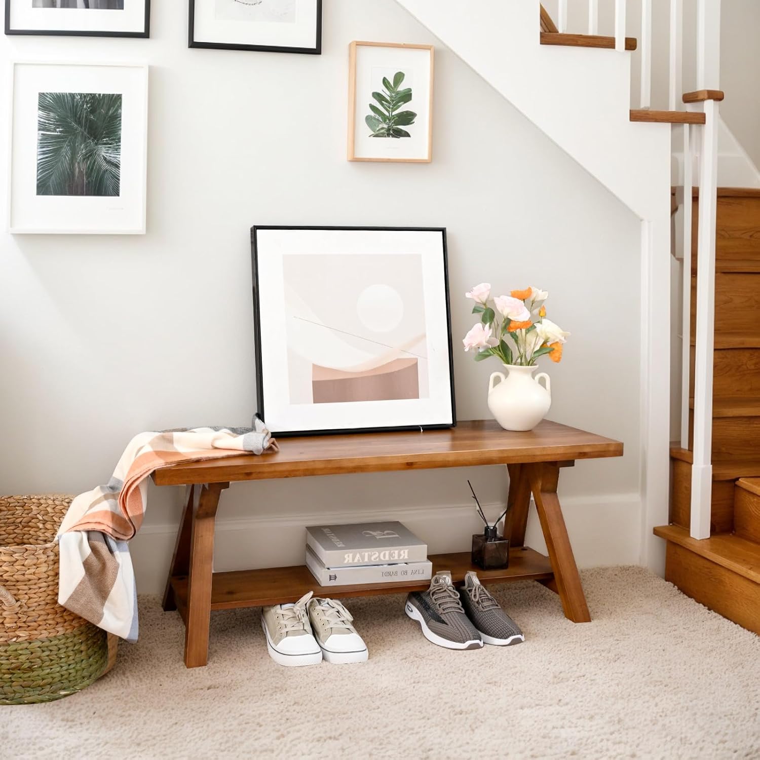 43 Inch Farmhouse Storage Bench, Rustic Solid Wood Entryway Bench for Living Room, Dining Room, Hallway | Indoor Seating with Natural Wood Finish
