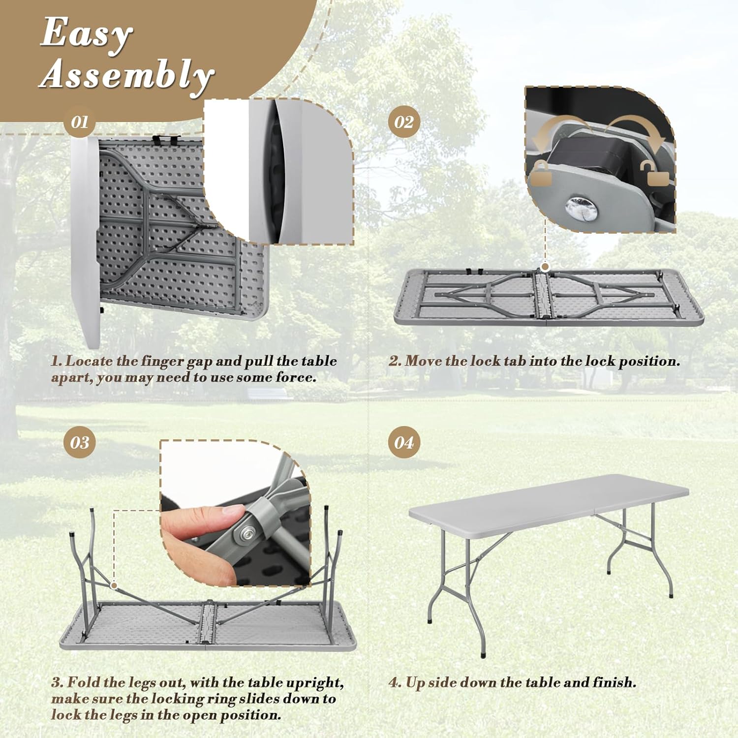 - Space-Saving and Portable: This folding table folds in half, making it easy to store in your car trunk. With a built-in handle, the protable table is super easy to carry wherever you go.