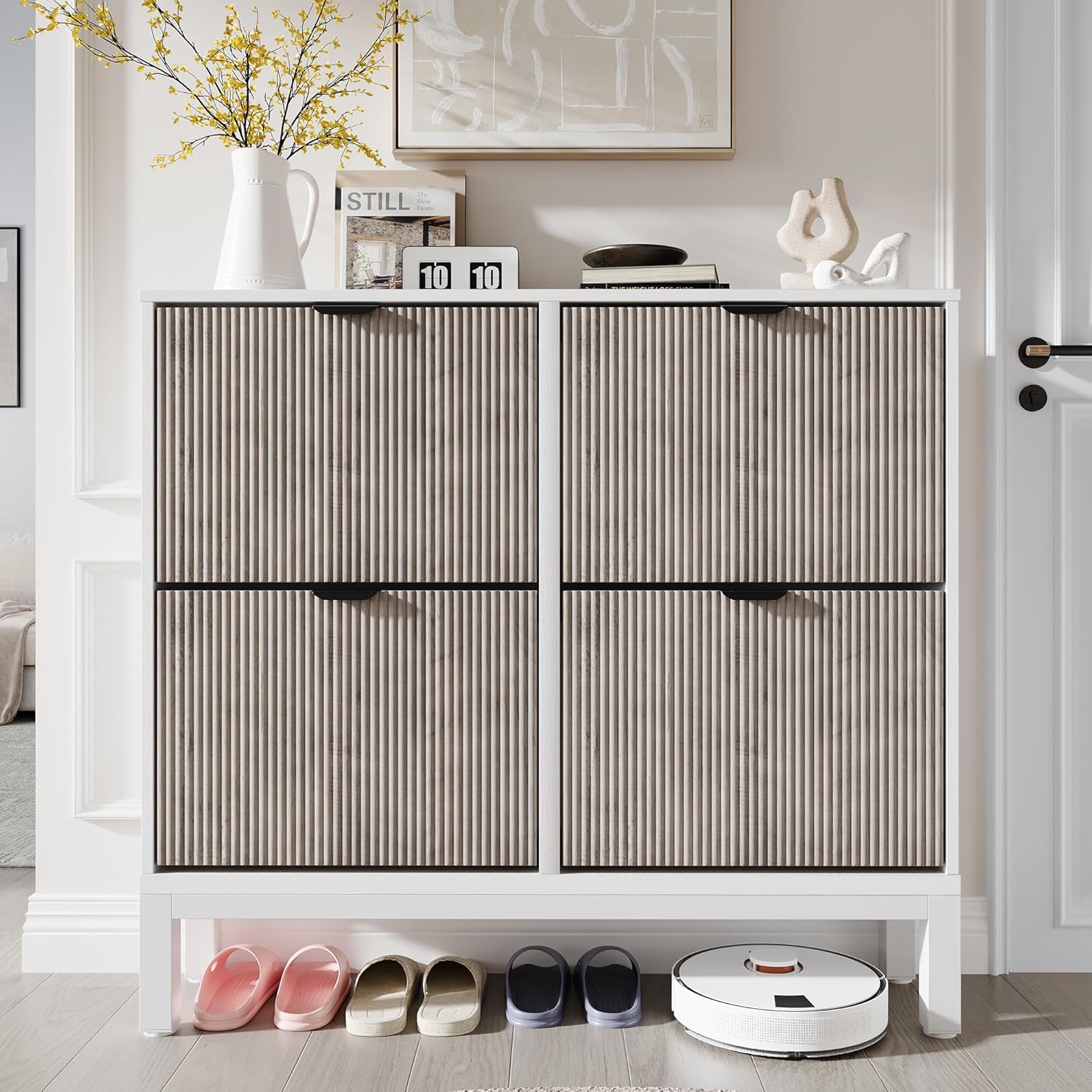 GarveeHome Fluted Shoe Storage Cabinet with 4 Flip Drawers, Narrow Wooden Shoe Organizer with Metal Legs, Modern Farmhouse Hidden Shoe Rack for Entryway, Hallway, White+Gray