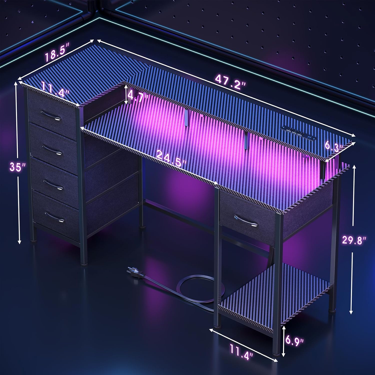 47 Inch Computer Gaming Desk with Power Outlets & LED Lights Reversible Home Office Desk with Adjustable 5 Fabric Storage Drawers for Working Writing Study, Carbon Fiber Black